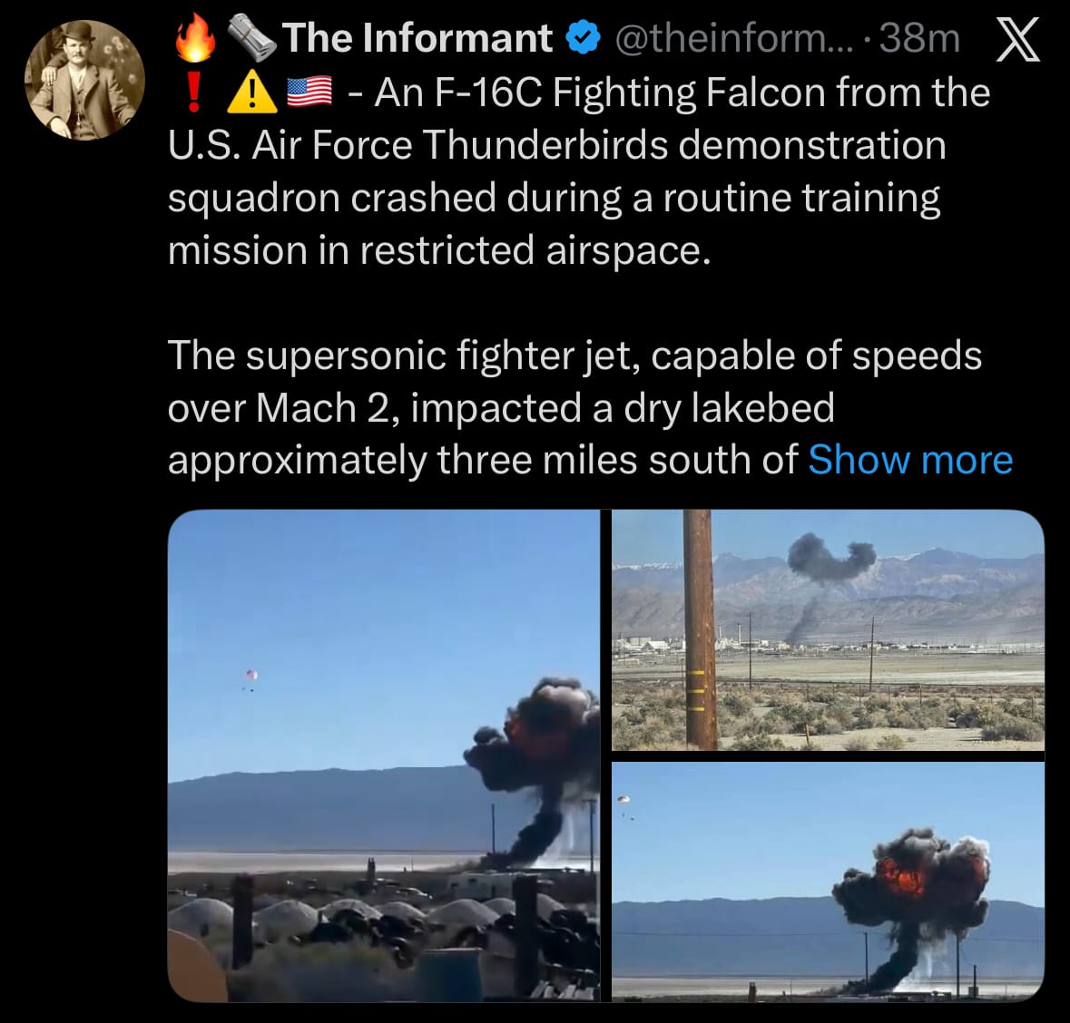 - On December 3, 2025, an F-16C Fighting Falcon assigned to the U.S. Air Force Thunderbirds demonstration squadron crashed during a routine training mission over controlled airspace in California's Mojave Desert, approximately two miles south of Trona Airport in San Bernardino County. The incident occurred at around 10:45 a.m. PST, near the edge of Death Valley National Park and about 27 miles northeast of Naval Air Weapons Station China Lake. The single-engine fighter jet, valued at roughly $20 million, impacted a dry lake bed, producing a large fireball and plume of black smoke, as captured in eyewitness videos and photos shared on social media. Local residents reported hearing a loud boom, and the crash site is in a remote, unpopulated area used for military exercises.