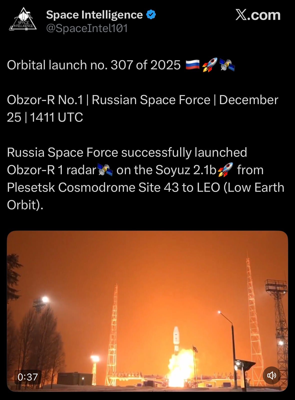 - On December 25, 2025, Russia successfully launched a Soyuz-2.1a rocket from Site 43/4 at the Plesetsk Cosmodrome, deploying the Obzor-R No.1 radar Earth observation satellite into sun-synchronous orbit. Liftoff occurred at 14:11 UTC (17:11 Moscow time), with the Russian Ministry of Defense confirming normal flight, orbital insertion, and establishment of stable telemetry; onboard systems were reported functioning normally. The mission, conducted by Aerospace Forces Space Troops, was described as placing a "spacecraft" (military satellite) in orbit, aligning with the long-delayed Obzor-R program.