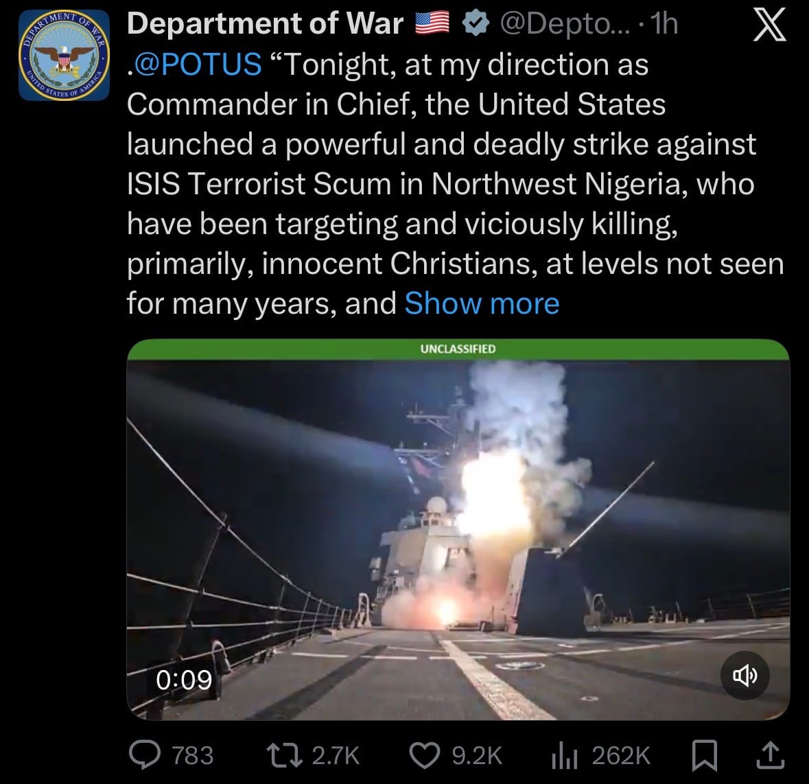 - On December 25, 2025, U.S. forces under U.S. Africa Command (AFRICOM) conducted airstrikes against Islamic State (ISIS)-affiliated militants in Sokoto State, northwest Nigeria. The operation was announced by President Donald Trump on Truth Social and confirmed by AFRICOM as having been carried out in coordination with and at the request of Nigerian authorities. AFRICOM reported the deaths of multiple militants with no civilian casualties.