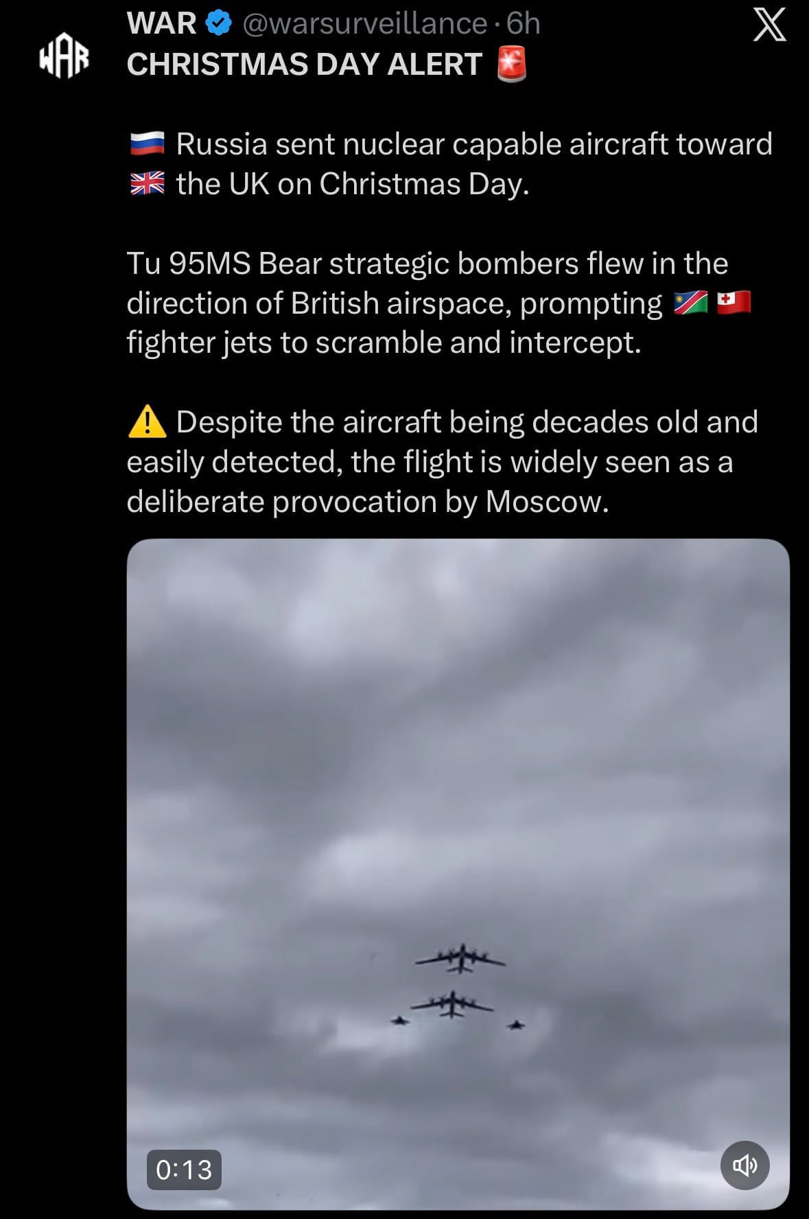 - On December 25, 2025, Russian Tu-95MS strategic bombers—nuclear-capable but armed conventionally for this mission—conducted a patrol over neutral waters of the Barents and Norwegian Seas, lasting more than seven hours. NATO fighter jets were scrambled to monitor and escort the aircraft at certain stages, as they approached areas near northern UK and Norwegian airspace without entering sovereign territory. Russia's Defense Ministry described the flight as a scheduled operation in full compliance with international rules, accompanied in parts by Su-33 fighters.