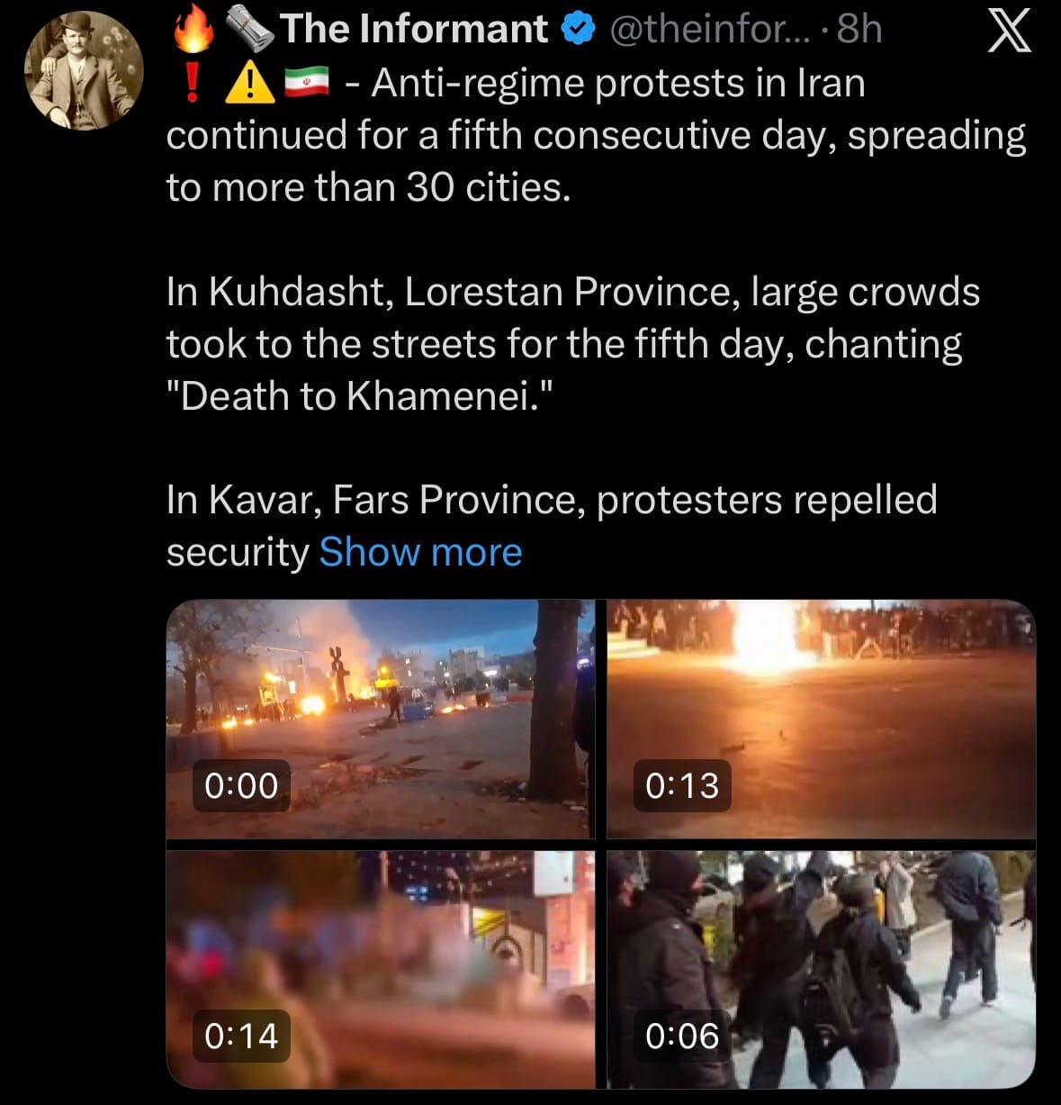 - On January 1, 2026, protests against Iran's government entered their fifth day, occurring in more than 30 cities, including Tehran, Isfahan, Kuhdasht and Azna in Lorestan Province, Kavar in Fars Province, and Neyshabur. Protesters chanted slogans such as "Death to Khamenei," briefly controlled streets in parts of Kavar after clashing with security forces, damaged a police station in Azna, and in Neyshabur voiced support for the return of Reza Pahlavi, the exiled crown prince and son of the former Shah. Reports of clashes indicate several deaths (estimates range from 3 to 6 among protesters and security personnel in places like Lordegan, Kuhdasht, and Azna) and injuries, with security forces reportedly using live ammunition in some locations.