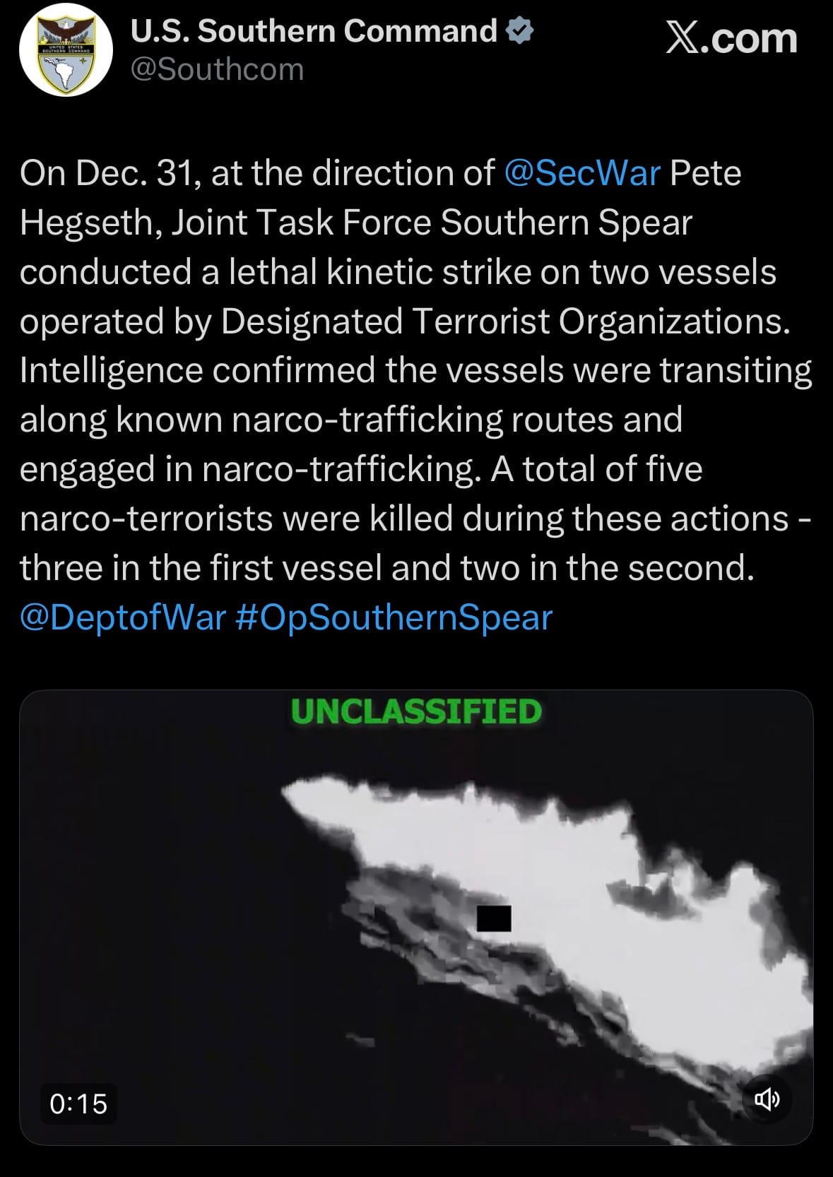 - On December 31, 2025, U.S. Joint Task Force Southern Spear carried out lethal kinetic strikes on two vessels in international waters of the Eastern Pacific. The strikes killed five individuals—three on the first vessel and two on the second—whom U.S. authorities described as narco-terrorists. Authorized by Secretary of Defense Pete Hegseth, the operations targeted boats that intelligence assessments indicated were operated by designated terrorist organizations, traveling along established narco-trafficking routes, and involved in drug smuggling activities.