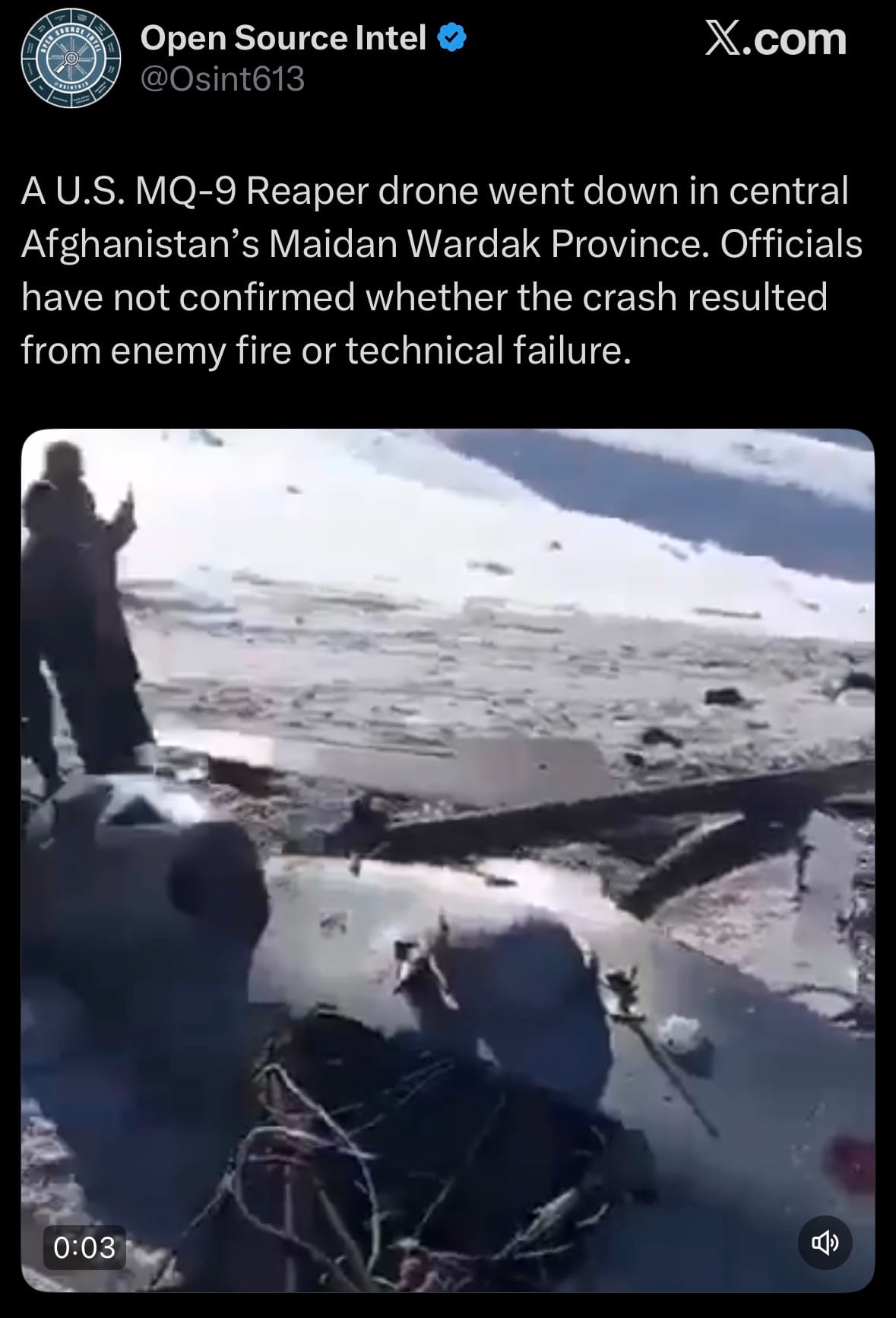 - On January 1, 2026, reports emerged of a U.S. Air Force MQ-9 Reaper unmanned aerial vehicle crashing near Maidan Shahr in central Afghanistan's Maidan Wardak Province (also spelled Wardak). Videos and photos circulating on social media showed wreckage consistent with an MQ-9, including distinctive tail and engine components, in a mountainous area west of Kabul, Afghanistan. The drone, valued at around $30 million, was reportedly on a routine mission, possibly operated remotely from a base like Al Udeid in Qatar.