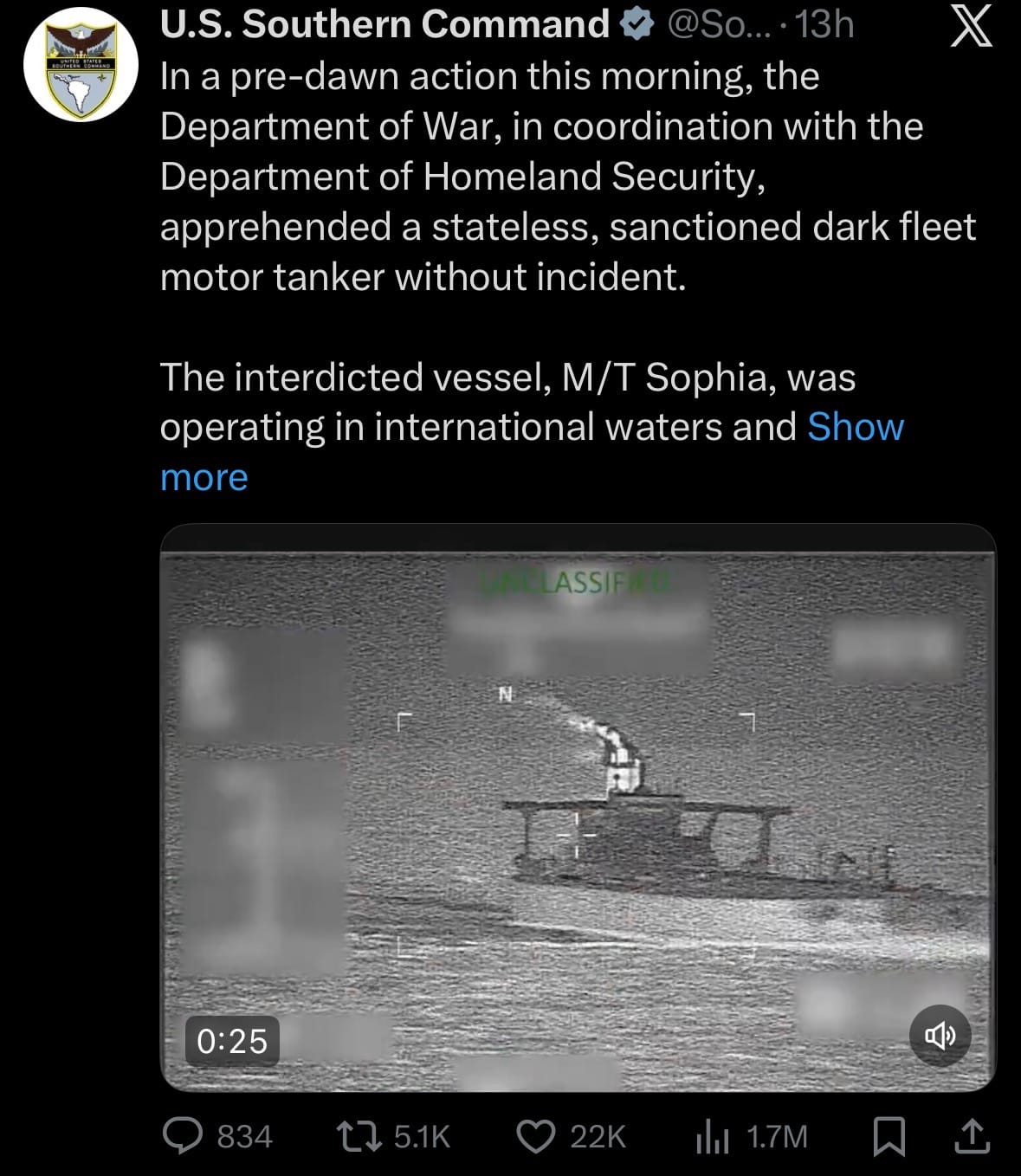 - On January 7, 2026, U.S. forces seized two sanctioned oil tankers linked to Venezuelan crude in separate operations: the Marinera (formerly Bella 1, Russian-flagged) in the North Atlantic near Iceland, and the M/T Sophia (described as stateless) in the Caribbean Sea. The Marinera, pursued for weeks after evading a prior boarding attempt near Venezuela, was intercepted despite Russian naval escort (including a submarine); the Sophia was boarded pre-dawn without incident. Both vessels were part of "dark fleet" networks accused of transporting sanctioned oil, with seizures executed under judicial warrants by the U.S. Coast Guard, supported by military assets.