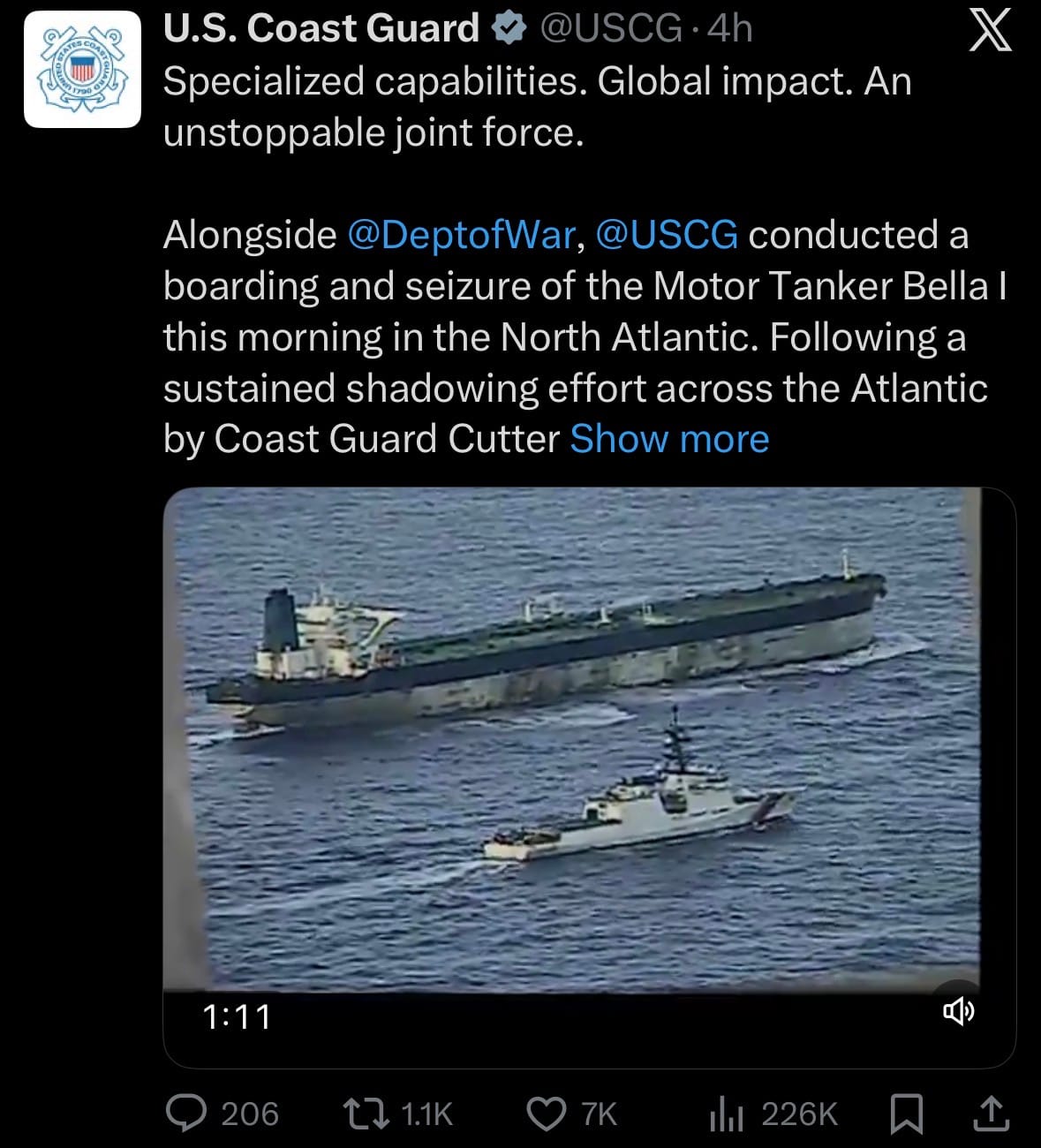 - The actions extend Operation Southern Spear and the U.S. blockade on Venezuelan oil flows post-Maduro's capture, with crews potentially facing prosecution and cargoes redirected. Russia condemned the Marinera seizure as "piracy," demanding crew safety, while the UK provided operational support. No casualties were reported, and the tankers are being escorted to U.S. ports. These seizures demonstrate continued U.S. enforcement against sanctions evasion globally, targeting shadow fleets to disrupt illicit trade. The involvement of a Russian-flagged vessel raises risks of diplomatic friction amid broader U.S.-Russia tensions.