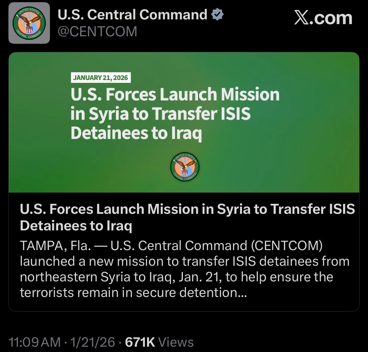 - On January 21, 2026, U.S. Central Command (CENTCOM) announced the launch of a new mission to transfer ISIS detainees from northeastern Syria to secure facilities in Iraq. The operation began that day with the successful movement of 150 ISIS fighters from a detention site in Hasakah, Syria, to a secure location in Iraq. CENTCOM stated that up to 7,000 ISIS detainees could eventually be transferred from Syrian facilities to Iraqi-controlled prisons as part of the effort.