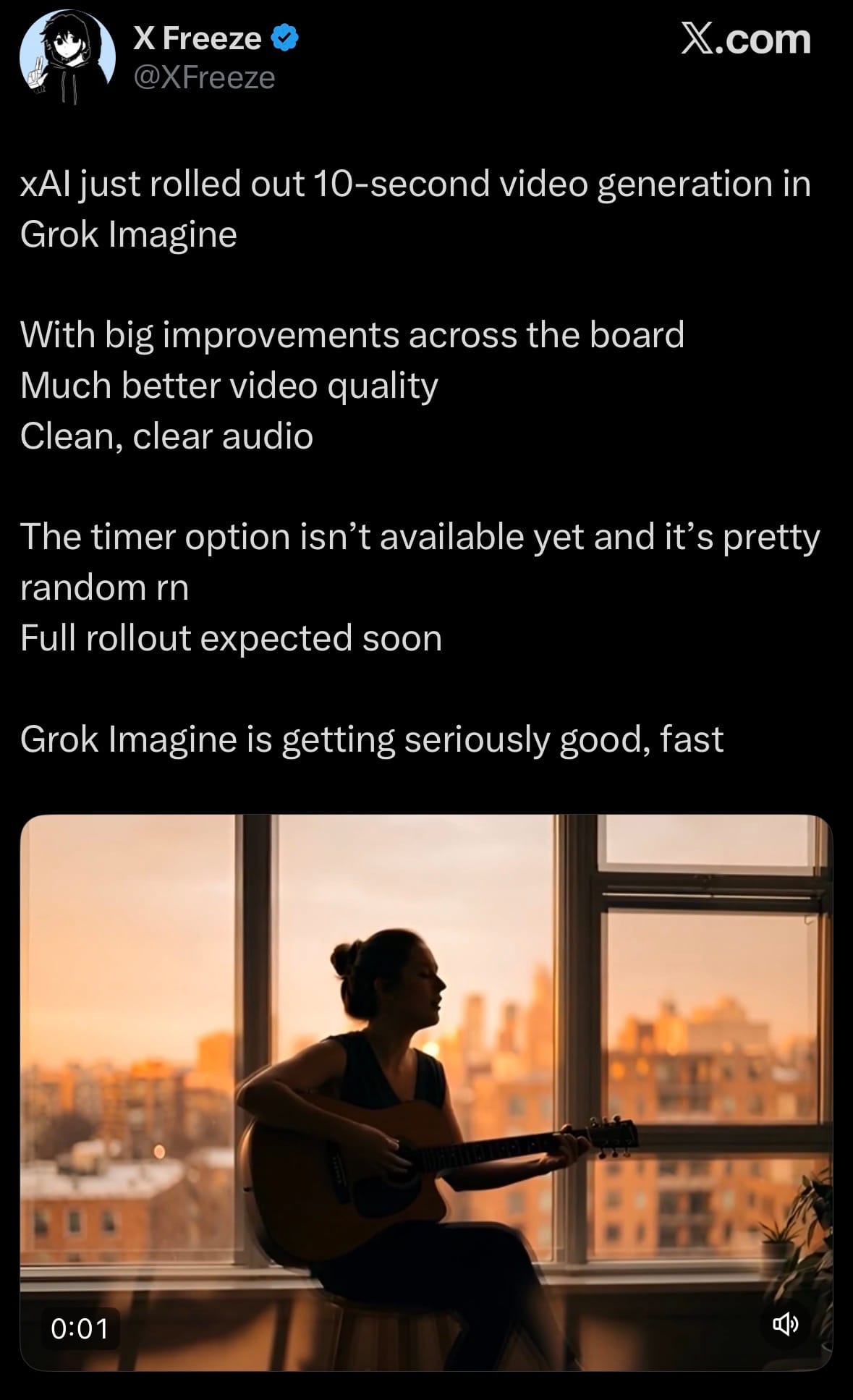 - The rollout is currently active for users (with some randomness in clip length and no timer control yet for precise duration selection), but a full stable version with refinements is expected soon. Early examples shared on X show dynamic scenes with better motion coherence and natural-sounding sound effects. This positions Grok Imagine as a faster, more accessible contender in AI video tools, with users noting rapid progress—though it remains in an evolving phase amid competition from tools like Sora, Veo, and Runway. Access is available via the Grok app on iOS/Android or web, subject to subscription tiers (e.g., Premium+ or SuperGrok for fuller/unlimited use), following recent restrictions on image features for non-paying users due to misuse concerns.