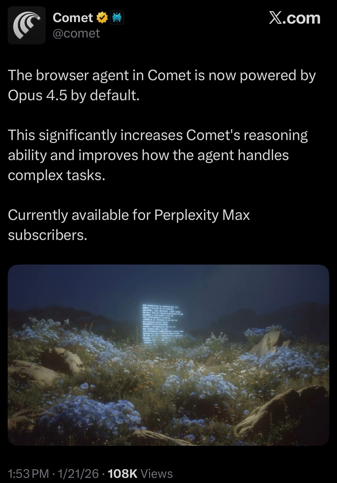 - On January 21, 2026, Perplexity updated the Comet browser's AI agent to use Claude Opus 4.5 as its default model. This upgrade greatly improves the agent's reasoning power and its ability to manage complex, multi-step tasks directly in the browser.