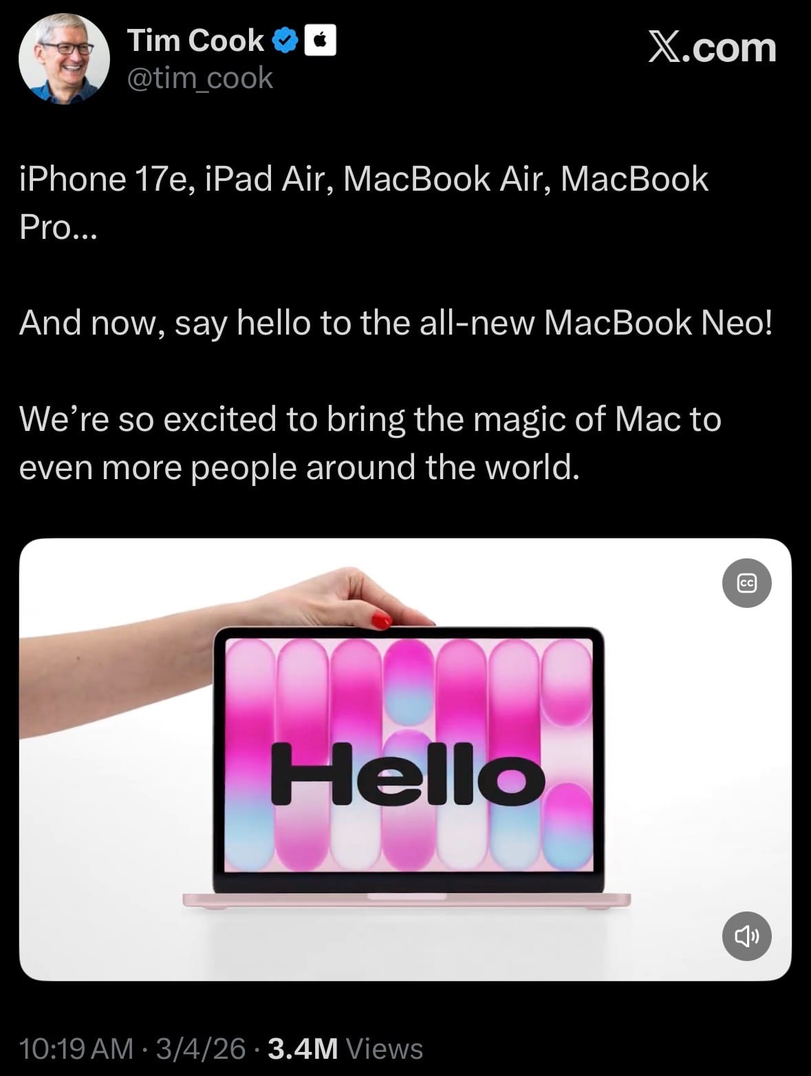 - On March 4, 2026, Apple unveiled the all-new MacBook Neo, an affordable entry-level laptop designed to bring the Mac experience to more people worldwide. It features a durable aluminum design in four vibrant colors (blush, indigo, silver, and citrus), a 13-inch Liquid Retina display, up to 16 hours of battery life, and the A18 Pro chip (from the iPhone 16 Pro series) for solid everyday performance, Apple Intelligence support, and seamless iPhone integration.