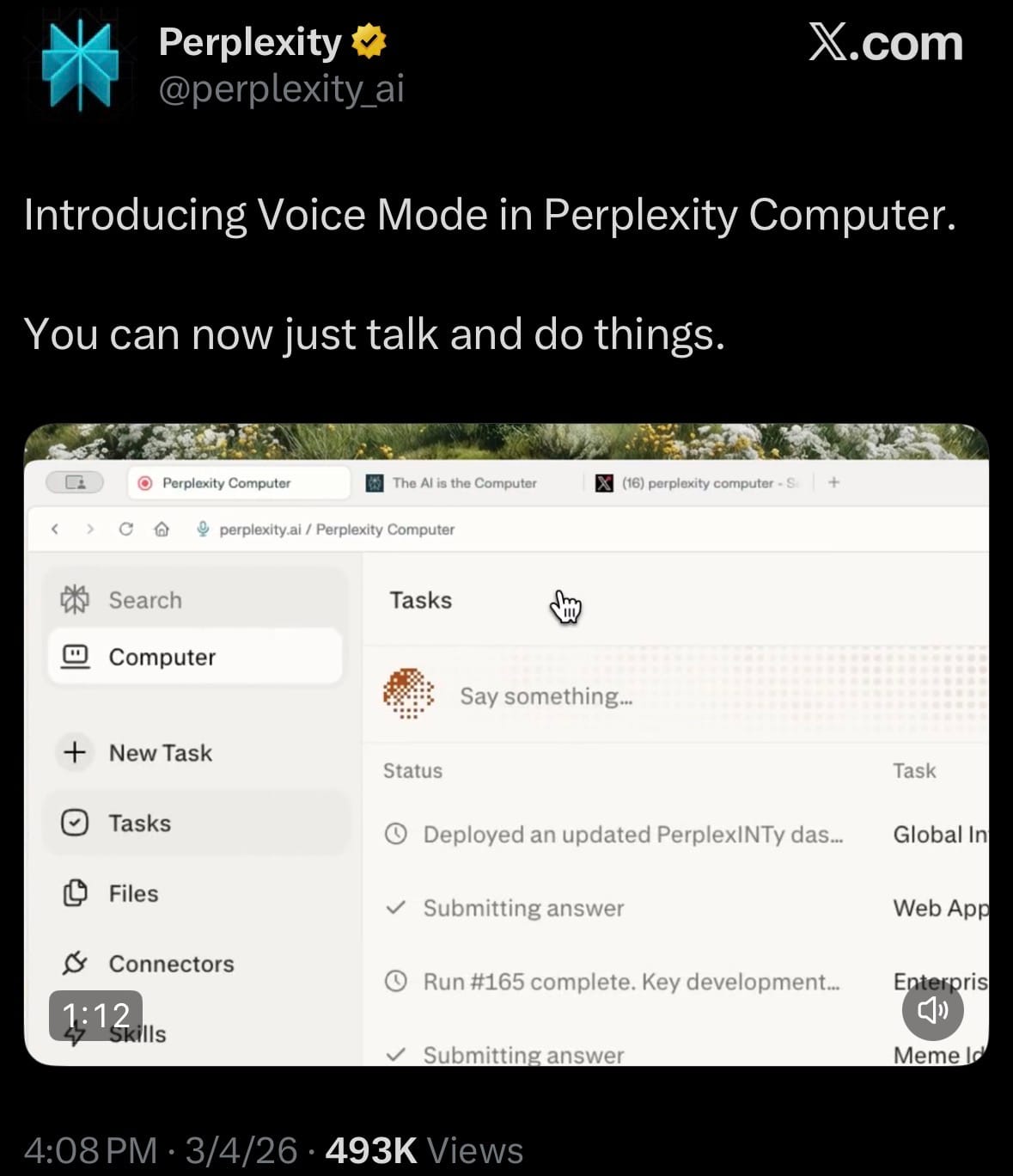 - On March 4, 2026, Perplexity introduced Voice Mode for its Perplexity Computer feature, enabling users to interact hands-free with the advanced AI agent system. This update allows people to simply speak their requests and commands, letting the AI handle complex workflows through natural conversation instead of typed inputs.