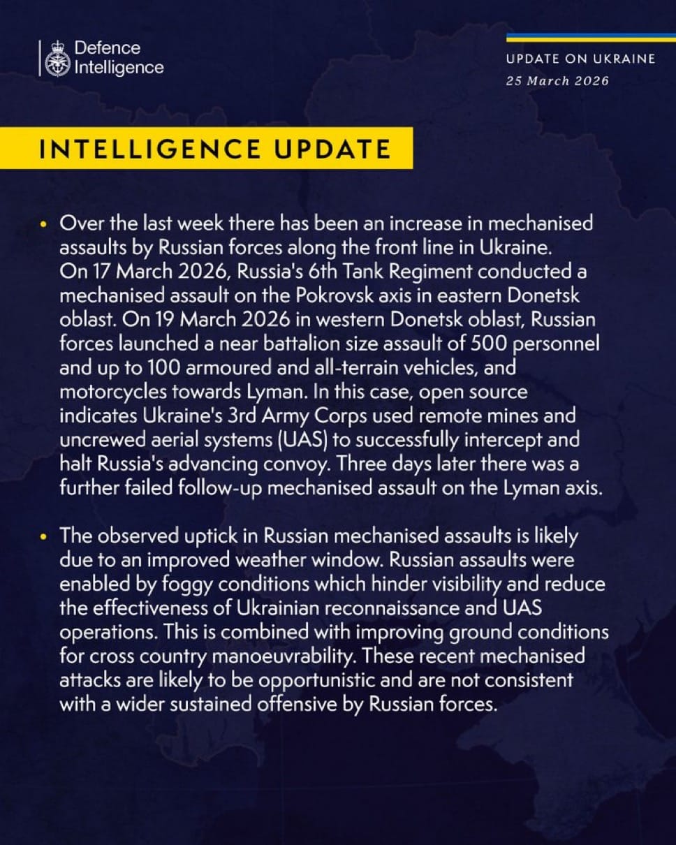 - On March 25, 2026, Ukraine conducted a major drone strike on the Ust-Luga oil port in Russia’s Leningrad Oblast on the Gulf of Finland, causing a massive fire that engulfed oil storage tanks and at least two tankers.