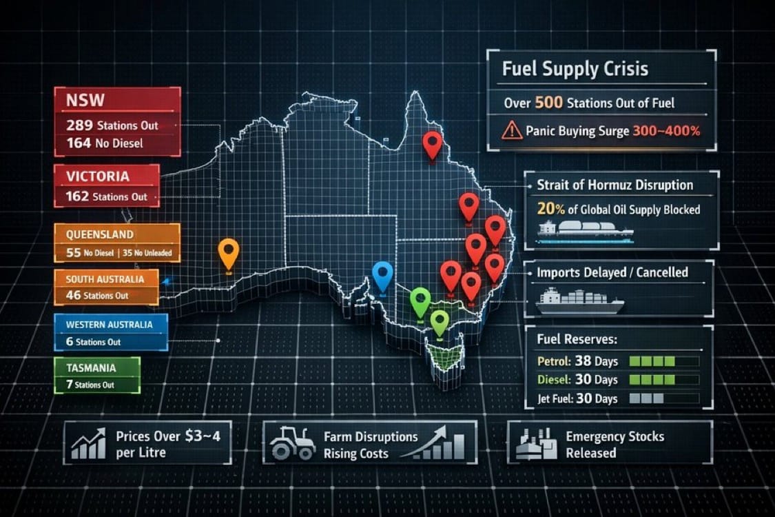 - As of March 25, 2026, over 500 petrol stations across Australia’s two largest states — New South Wales and Victoria — have run out of at least one type of fuel, mainly due to panic buying triggered by the ongoing Middle East war and global oil supply disruptions. The shortages are now spreading to other states including Queensland and South Australia.