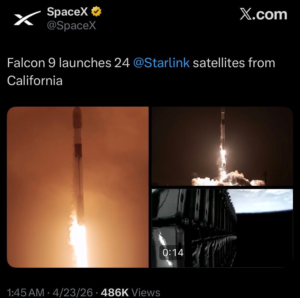 - On April 22, 2026 (April 23 UTC), SpaceX successfully launched Starlink Group 17-14 from SLC-4E at Vandenberg Space Force Base in California using a Falcon 9 rocket. The mission deployed 24 Starlink v2 Mini satellites into a sun-synchronous low-Earth orbit to expand global broadband coverage.