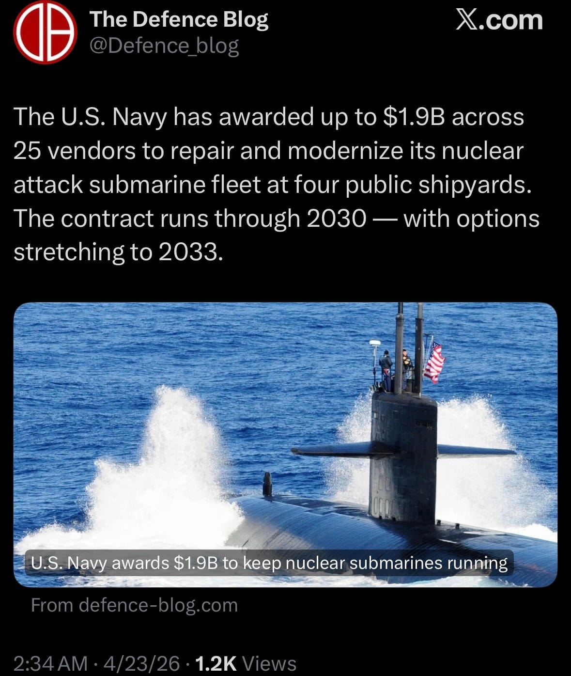 - On April 23, 2026, the U.S. Navy awarded a major contract worth up to $1.9 billion to 25 vendors to repair, maintain, and modernize its fleet of nuclear attack submarines (Virginia and Los Angeles classes) at the four public shipyards (Portsmouth, Norfolk, Puget Sound, and Pearl Harbor).
