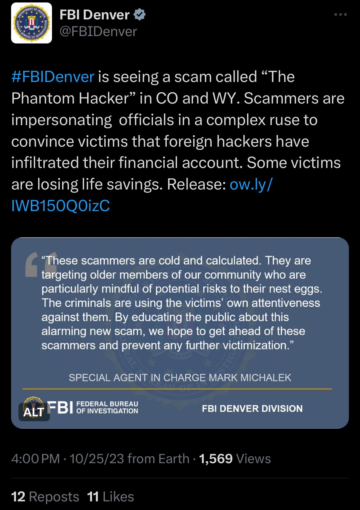 - The FBI in Denver is warning about a scam called “The Phantom Hacker,” targeting mainly older people. Scammers pretend to be from tech companies, banks, or the government, telling victims their financial accounts are at risk from foreign hackers.