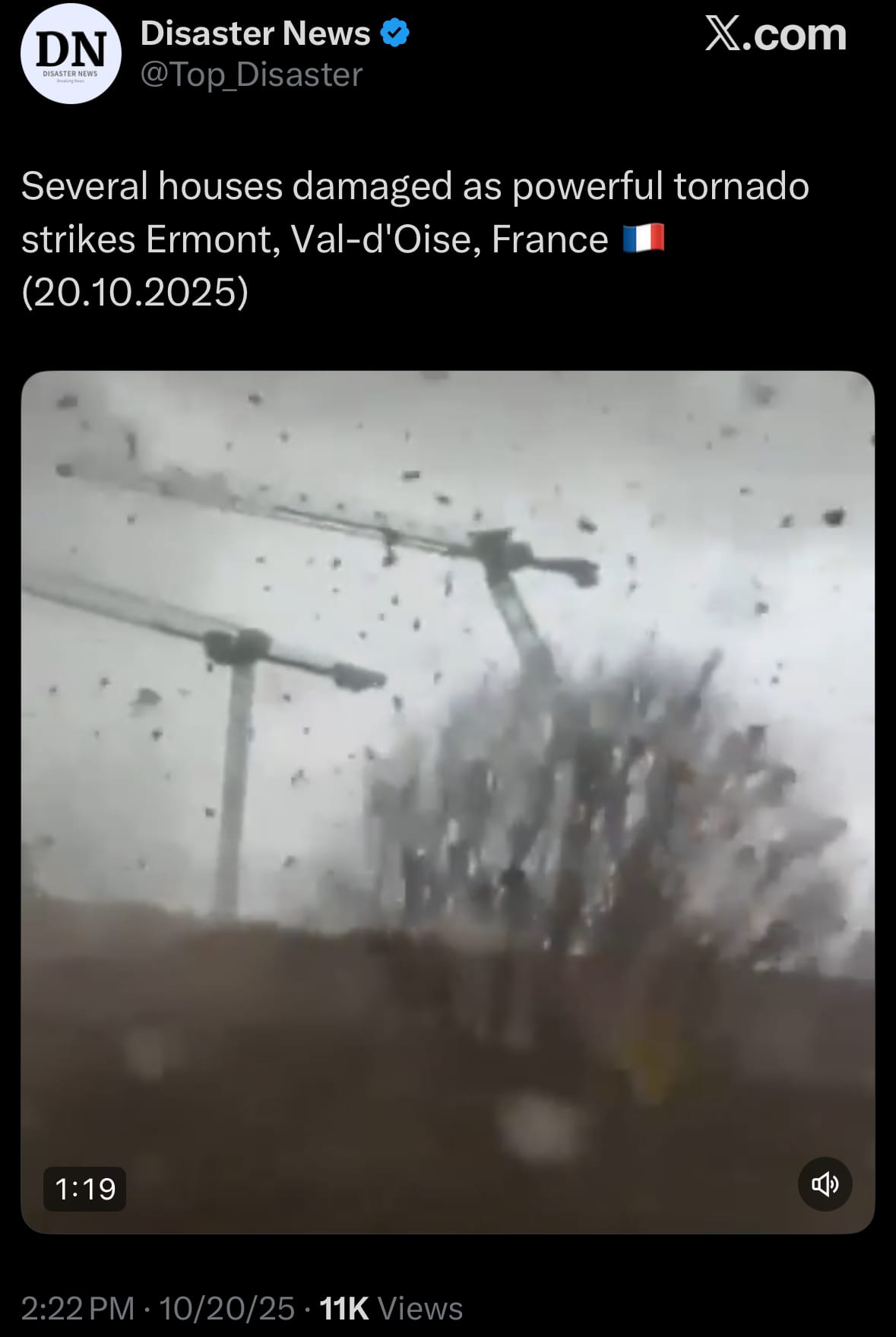 - On October 20, 2025, a tornado struck the northern suburbs of Paris, France, specifically in the town of Ermont in Val-d'Oise department, causing significant damage and casualties. The storm toppled three construction cranes at a building site, resulting in the death of one worker and injuries to at least 10 others, with four in critical condition. It also caused power outages affecting over 1,500 homes, disrupted traffic due to fallen trees, and led to emergency responses from local authorities.