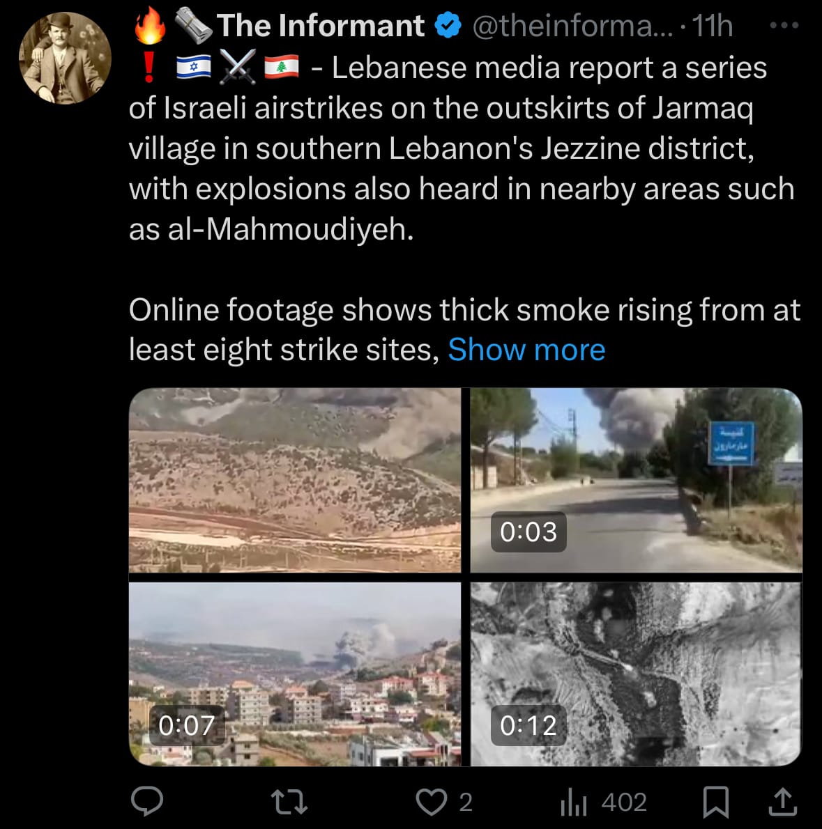 - On October 20, 2025, the Israeli military carried out airstrikes on Hezbollah targets in southern Lebanon, including eight raids near the villages of Jarmaq and Aishiyeh in the Jezzine district, as well as strikes in the Mahmoudiyeh and Jarmak areas.
