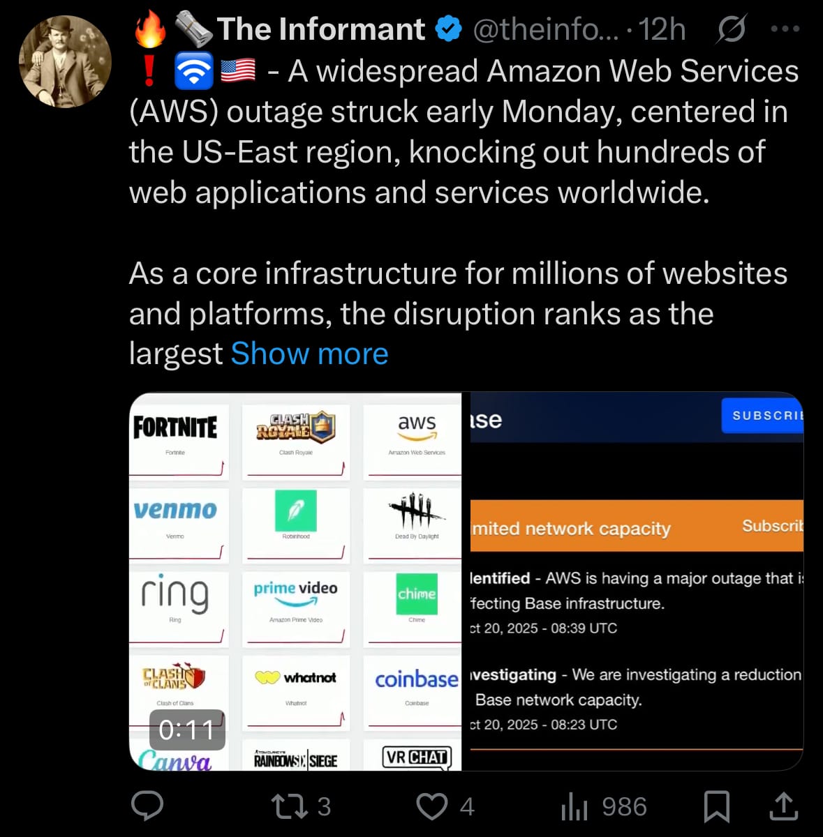 - On October 20, 2025, Amazon Web Services (AWS) faced a significant global outage starting in the morning, affecting many websites and apps such as Snapchat, Ring, Signal, Coinbase, and Robinhood. The problem mainly hit the US-EAST-1 region in Northern Virginia, impacting over 2,000 companies and causing issues in services like DynamoDB, SQS, and EC2 networking. Users saw errors when trying to access platforms, and Downdetector recorded thousands of reports, but no safety threats or data losses were identified. The outage came from a fault in a main database directory service, causing downtime of up to 15 hours before everything was fixed.