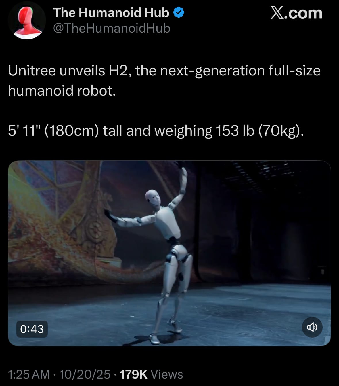 - On October 20, 2025, Unitree Robotics unveiled the H2, its next-generation full-size humanoid robot, standing at 180 cm tall and weighing 70 kg. The robot features a more humanlike appearance with a bionic face and is designed for agile movements, including demonstrations of ballet, kung fu, and graceful spins. Equipped with 31 joints for enhanced flexibility, it builds on the company's previous H1 model by incorporating advanced sensors and AI for tasks like navigation, object manipulation, and interaction in real-world environments. The unveiling video emphasized its safe and friendly design, aimed at serving users in domestic or industrial settings without complex setup.