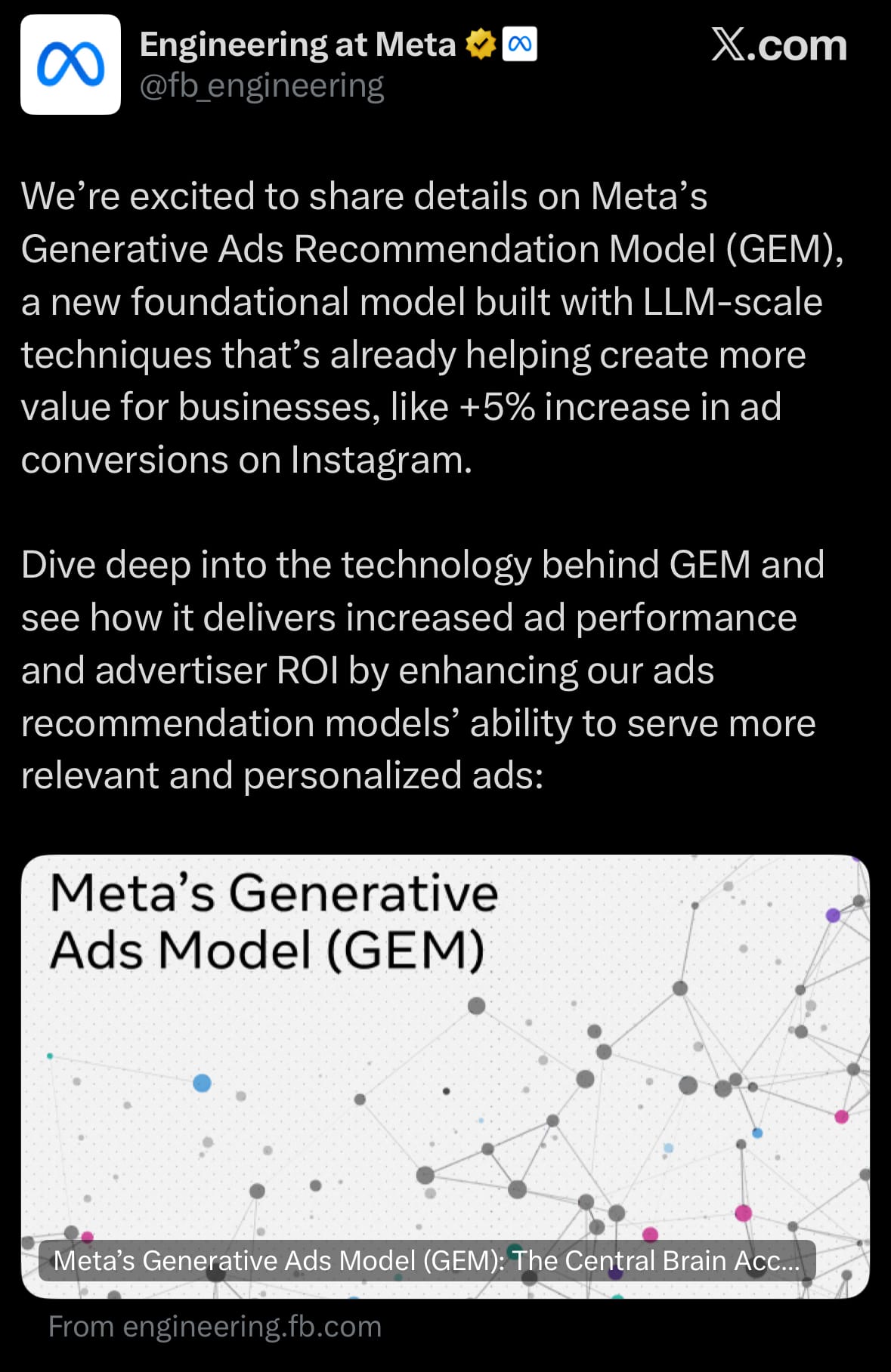 - GEM enhances ad suggestions by sharing knowledge through after-training steps like distillation, representation learning, and parameter sharing, helping other models gain insights for stronger personalization and match to user needs. This has led to clear improvements, such as a 5 percent rise in ad conversions on Instagram and a 3 percent increase on Facebook Feed since its early rollout this year, with third-quarter updates doubling efficiency from more data and computing power. For advertisers, these changes mean better returns on spending through refined campaigns that increase engagement, sales, and overall results, while handling issues like limited data signals and varied goals in a changing setting.