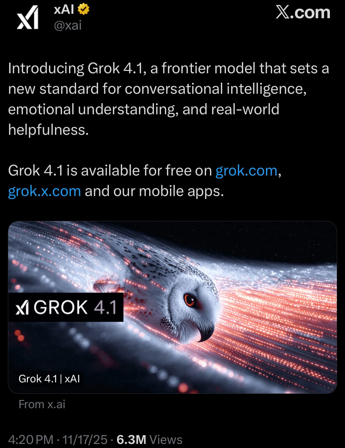 - On November 17, 2025, xAI announced the release of Grok 4.1, an updated version of its AI model designed to enhance conversational capabilities and overall performance. The model is now available to all users on grok.com, X.com, and the iOS and Android apps, with an immediate rollout in auto mode and explicit selection options for users. It builds on Grok 4 by incorporating refinements for more natural and fluid dialogue, while maintaining access restrictions for premium features. A silent rollout phase occurred from November 1 to 14 for testing, leading to the full public launch today.