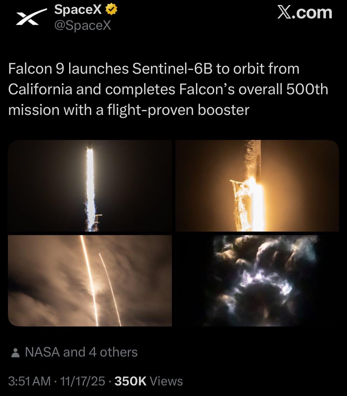 - On November 16, 2025, SpaceX successfully launched the Sentinel-6B satellite aboard a Falcon 9 rocket from Space Launch Complex 4E at Vandenberg Space Force Base in California, with liftoff occurring at 9:21 p.m. PT after a brief delay from the initial window. The reusable first-stage booster, on its third flight, separated as planned and landed on a drone ship in the Pacific Ocean, marking another milestone in SpaceX's recovery operations. The upper stage deployed the satellite into a sun-synchronous orbit approximately one hour after launch, with no anomalies reported during the ascent.