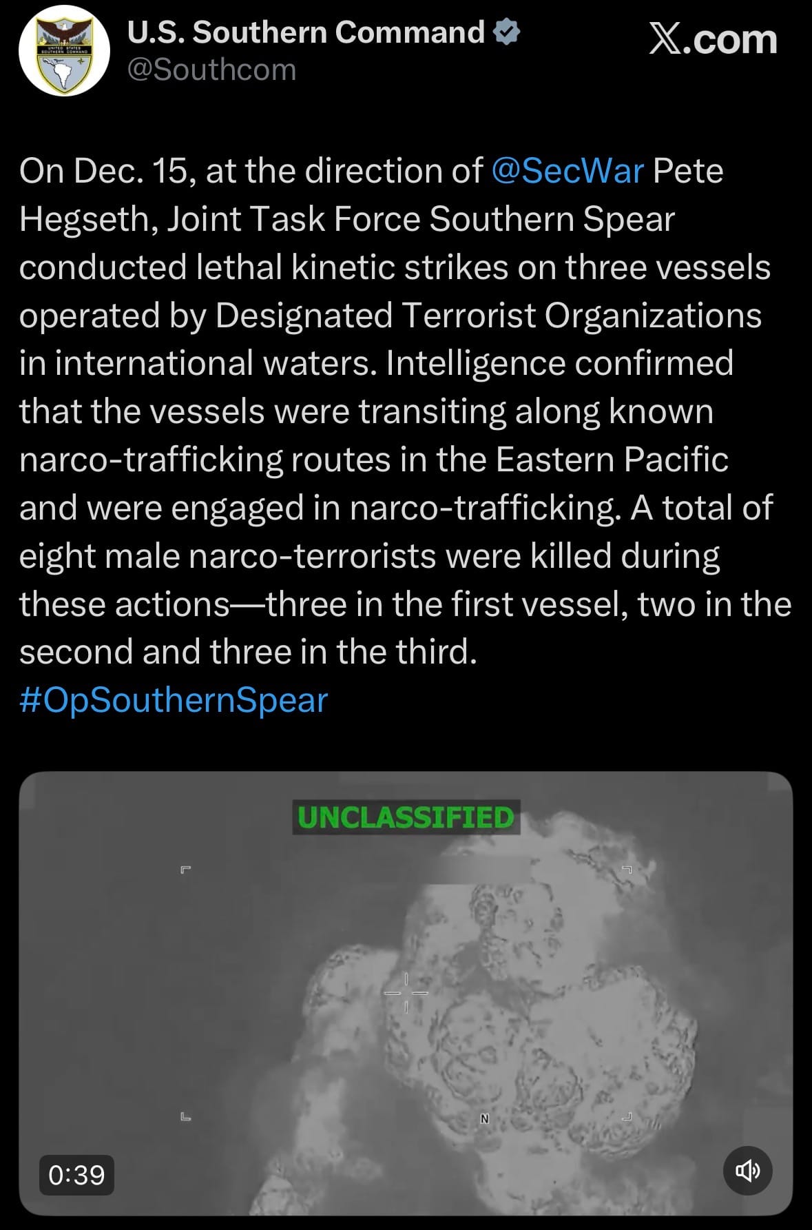 - On December 15, 2025, U.S. Southern Command (SOUTHCOM) announced that Joint Task Force Southern Spear conducted lethal kinetic strikes on three vessels in international waters of the Eastern Pacific. The strikes, directed by Secretary of War Pete Hegseth, targeted boats operated by designated terrorist organizations, which intelligence indicated were transiting known narco-trafficking routes and engaged in drug smuggling.