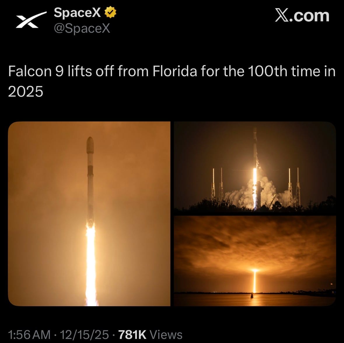 - On December 15, 2025, SpaceX launched the Starlink Group 6-82 mission using a Falcon 9 rocket from Space Launch Complex 40 at Cape Canaveral Space Force Station in Florida. Liftoff occurred at 12:25 a.m. EST (05:25 UTC) after weather concerns, including low-level winds, delayed earlier attempts. The mission deployed 29 Starlink V2 Mini satellites into low Earth orbit to expand the company's global broadband constellation. The first-stage booster (B1092) successfully landed on the droneship A Shortfall of Gravitas in the Atlantic Ocean, marking its ninth flight and SpaceX's 550th booster recovery overall.