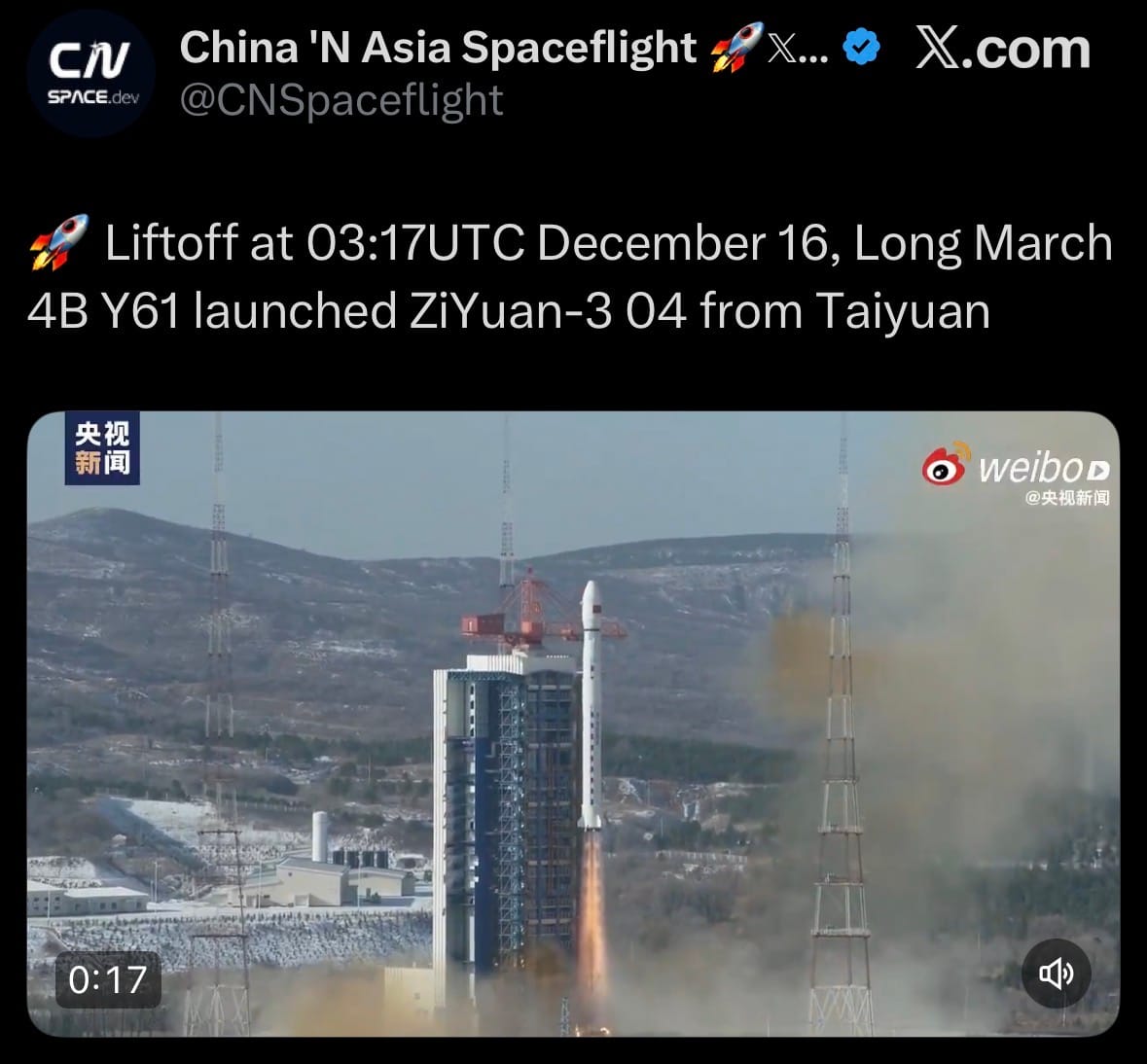 - On December 16, 2025, China launched the Ziyuan-3 04 (ZY-3 04) satellite aboard a Long March 4C (Chang Zheng-4C) rocket from the Taiyuan Satellite Launch Center in Shanxi Province. The mission deployed the fourth high-resolution Earth observation satellite in the Ziyuan-3 series, designed for stereo mapping and remote sensing. Operated by the Ministry of Natural Resources, the satellite provides panchromatic imagery at approximately 2.1-2.7 meters resolution, along with multispectral capabilities, supporting applications in land resource surveys, urban planning, disaster management, agriculture, and environmental monitoring.