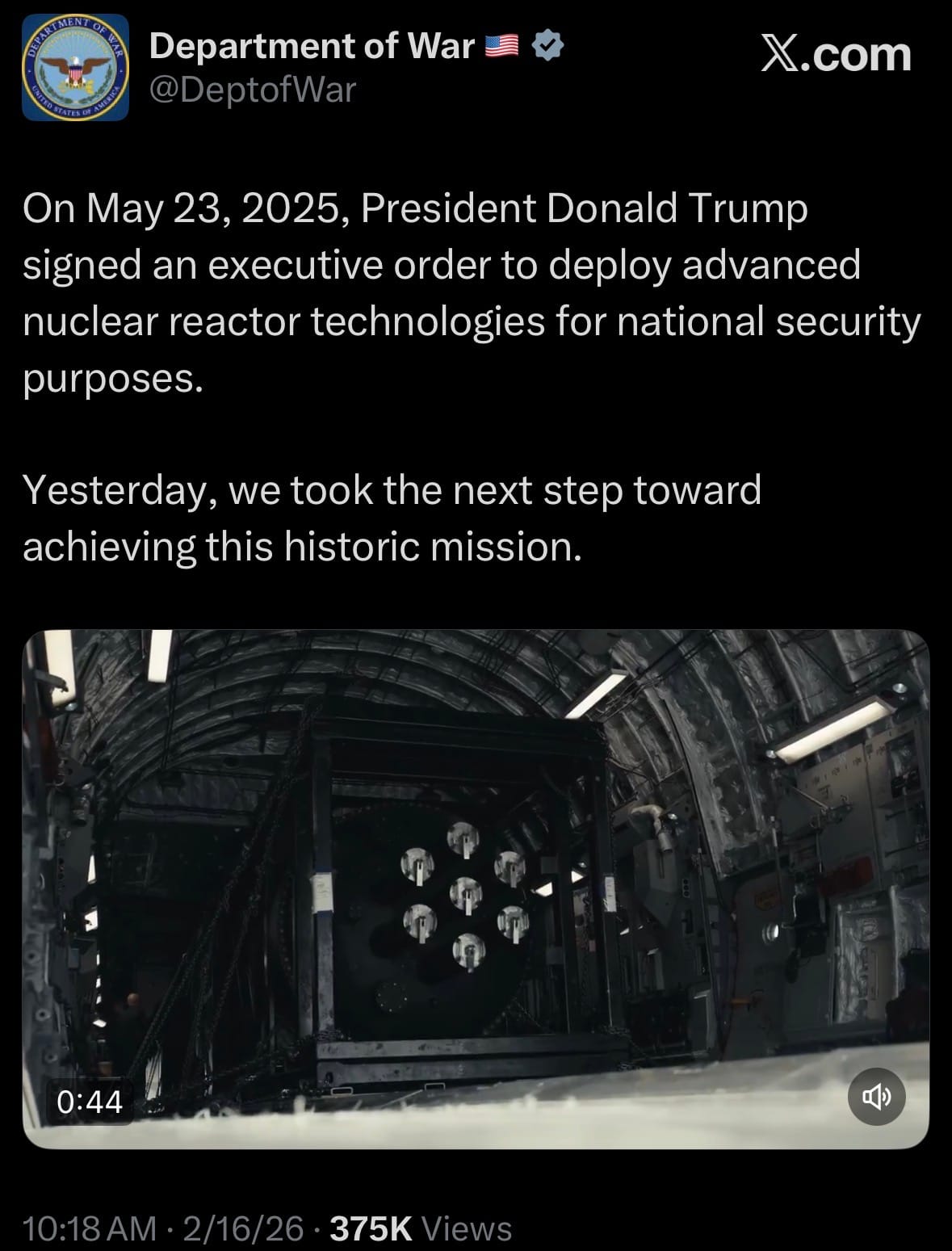 - On February 16, 2026, the U.S. Department of Defense and Department of Energy announced the successful air transport of Valar Atomics' Ward 250 micro nuclear reactor components—a 5-megawatt, transportable advanced reactor—from March Air Reserve Base, California, to Hill Air Force Base, Utah, via C-17 Globemaster III aircraft on February 15. The unfueled modules will next move to the Utah San Rafael Energy Lab in Orangeville for testing. Officials called it the first airlift of a nuclear reactor, advancing President Donald Trump's Executive Order 14299 (signed May 23, 2025) to deploy advanced nuclear technologies for national security, military energy resilience, and potential AI infrastructure support.