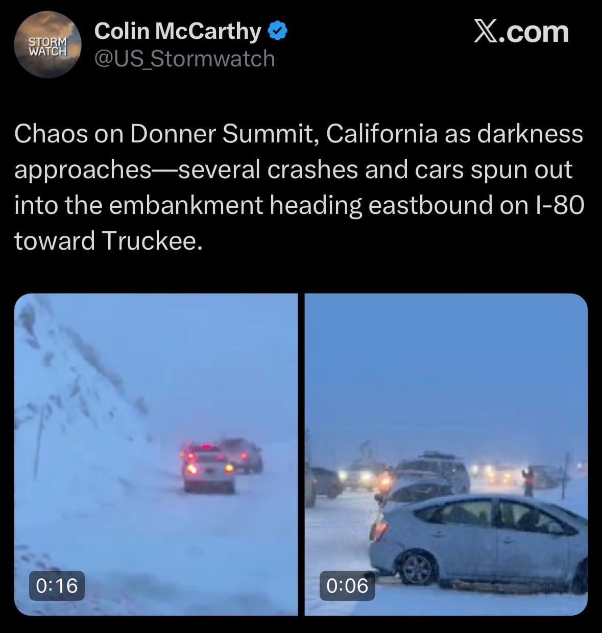 - On February 16, 2026, heavy snow and poor visibility caused hazardous conditions on Donner Summit along eastbound Interstate 80 near Truckee, California, leading to several vehicle spin-outs, crashes, and vehicles sliding into embankments as darkness fell. The California Highway Patrol and Caltrans closed I-80 in both directions over the summit around midday due to the accumulating incidents and whiteout conditions from an ongoing winter storm.