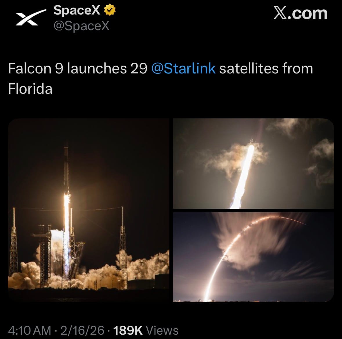 - On February 16, 2026, SpaceX successfully launched the Starlink Group 6-103 mission at 2:59 a.m. ET (07:59 UTC) using a Falcon 9 rocket from Space Launch Complex 40 at Cape Canaveral Space Force Station, Florida. The mission deployed 29 Starlink v2 Mini satellites into low-Earth orbit, adding to the company's broadband internet constellation, which now exceeds 9,600 satellites.