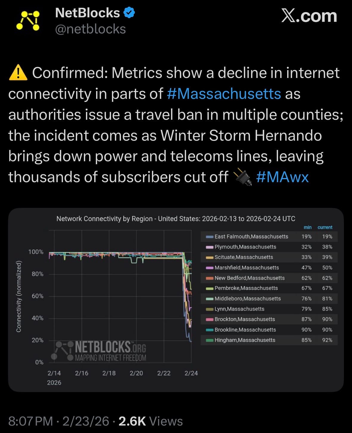 - On February 23, 2026, Winter Storm Hernando, a powerful bomb cyclone and nor'easter, is battering the Northeastern U.S. with heavy wet snow (up to 2–3 feet in places), blizzard conditions, and wind gusts over 50–70 mph, causing widespread downed trees, power lines, and telecom disruptions. In Massachusetts, over 280,000 customers remain without power—mostly in eastern areas like Plymouth and the South Shore—leading to reduced internet connectivity and travel bans in multiple counties.