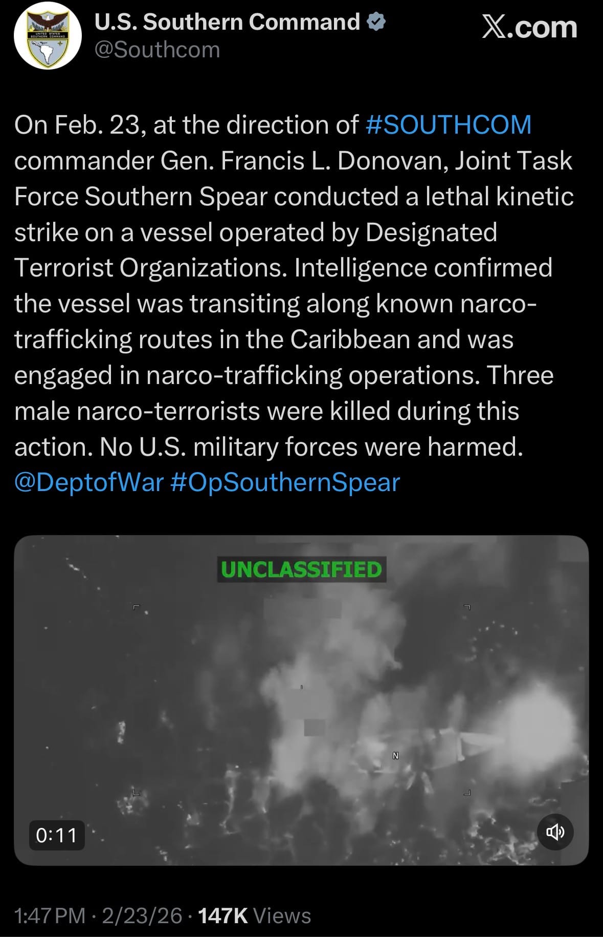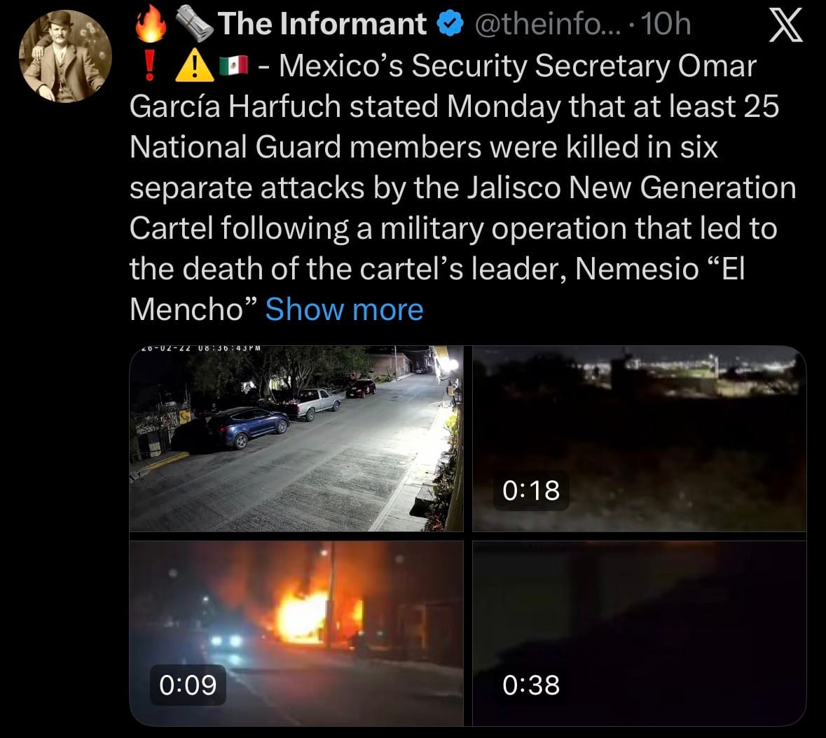 - On February 23, 2026, Mexico’s Security Secretary Omar García Harfuch reported that at least 25 National Guard members were killed in six separate attacks by the Jalisco New Generation Cartel (CJNG) following a military raid that resulted in the death of cartel leader Nemesio “El Mencho” Oseguera Cervantes. The violence began after a Sunday operation in Tapalpa, Jalisco, where Oseguera Cervantes was wounded in a shootout with special forces and died en route to Mexico City, with U.S. intelligence aiding the mission against the cartel.