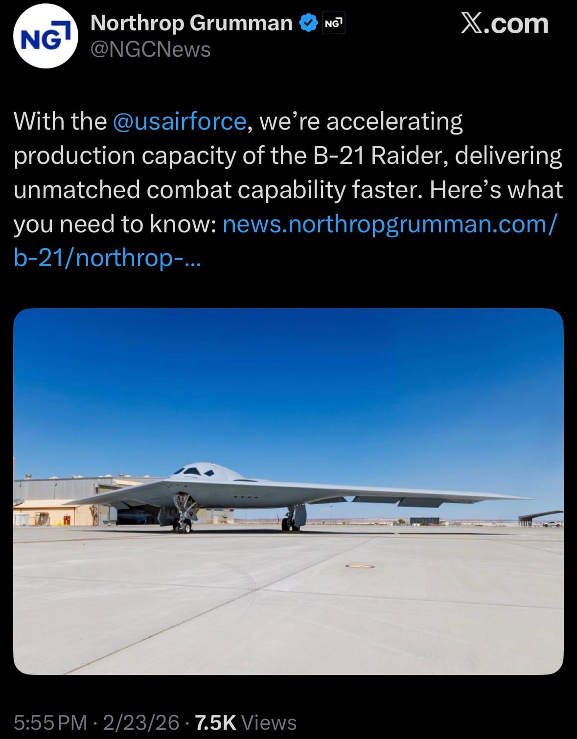 - Northrop Grumman has invested over $5 billion in digital engineering and manufacturing across U.S. facilities to enable faster, more efficient scaling of the sixth-generation stealth bomber. The first aircraft remains on track for delivery to Ellsworth Air Force Base in 2027, delivering unmatched long-range strike and deterrence capabilities sooner.