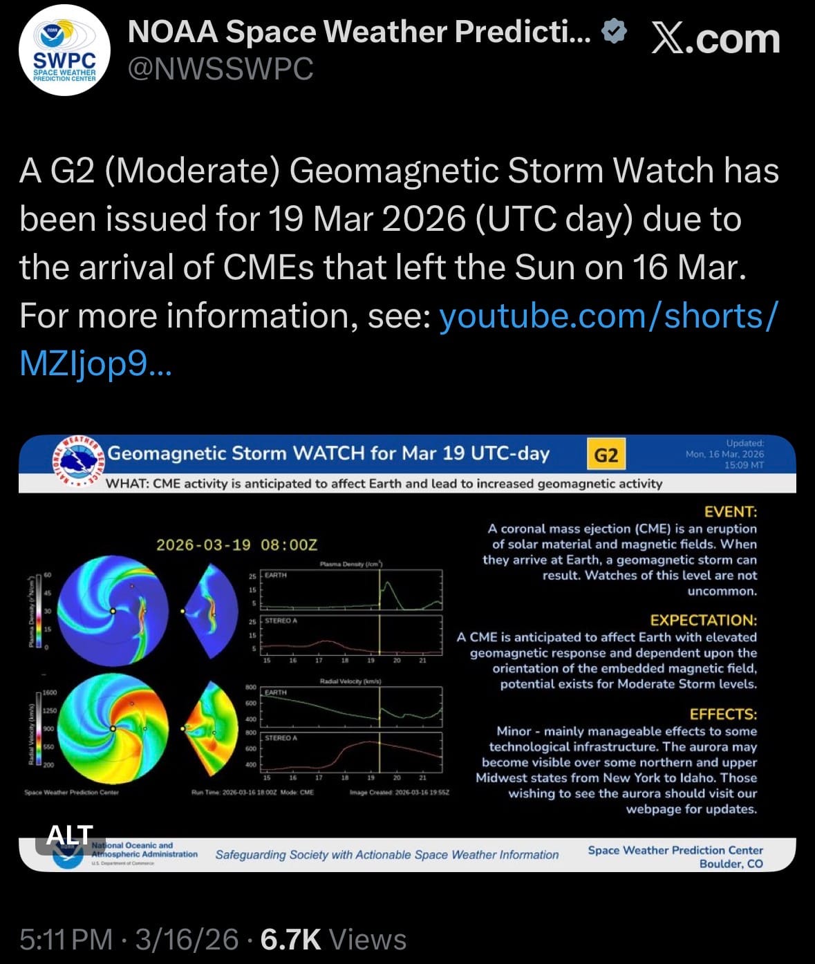 - As of March 16, 2026, NOAA issued a G2 (Moderate) Geomagnetic Storm Watch for March 19, 2026 (UTC), due to coronal mass ejections (CMEs) from an M2.7 solar flare on March 16 expected to arrive that day. A G2 storm may produce auroras visible as far south as New York, cause minor voltage issues or alarms in high-latitude power grids, increase satellite drag, and lead to some HF radio fading at higher latitudes.