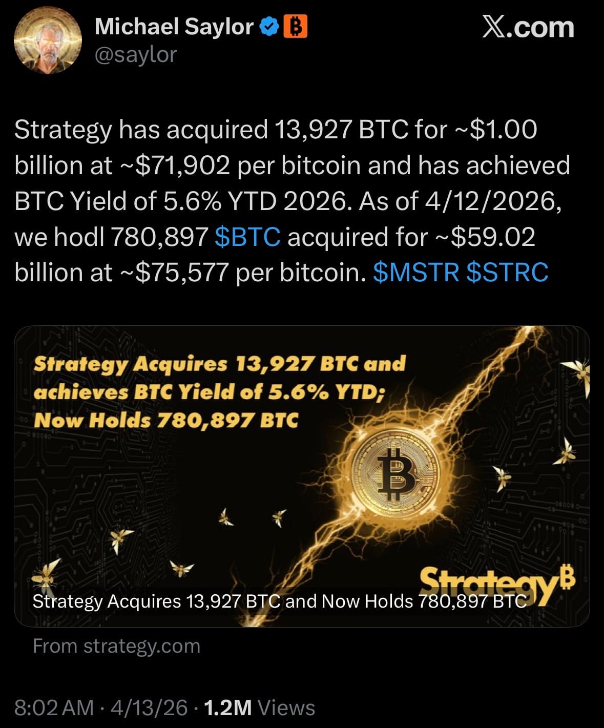 - On April 13, 2026, Strategy (formerly MicroStrategy, $MSTR) announced it acquired another 13,927 BTC for ~$1.00 billion at an average price of ~$71,902 per bitcoin, bringing its total holdings to 780,897 BTC as of April 12. These were purchased for a cumulative ~$59.02 billion at an average cost of ~$75,577 per bitcoin, and the company has delivered a 5.6% BTC Yield year-to-date in 2026.