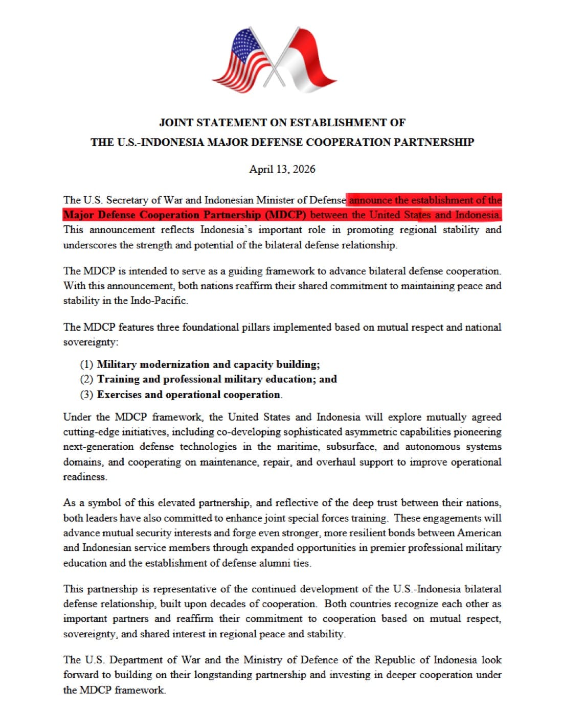 - On April 13, 2026, the U.S. Secretary of War and the Indonesian Minister of Defense announced the establishment of the U.S.-Indonesia Major Defense Cooperation Partnership (MDCP), a new high-level bilateral defense framework designed to strengthen military ties and promote stability in the Indo-Pacific.