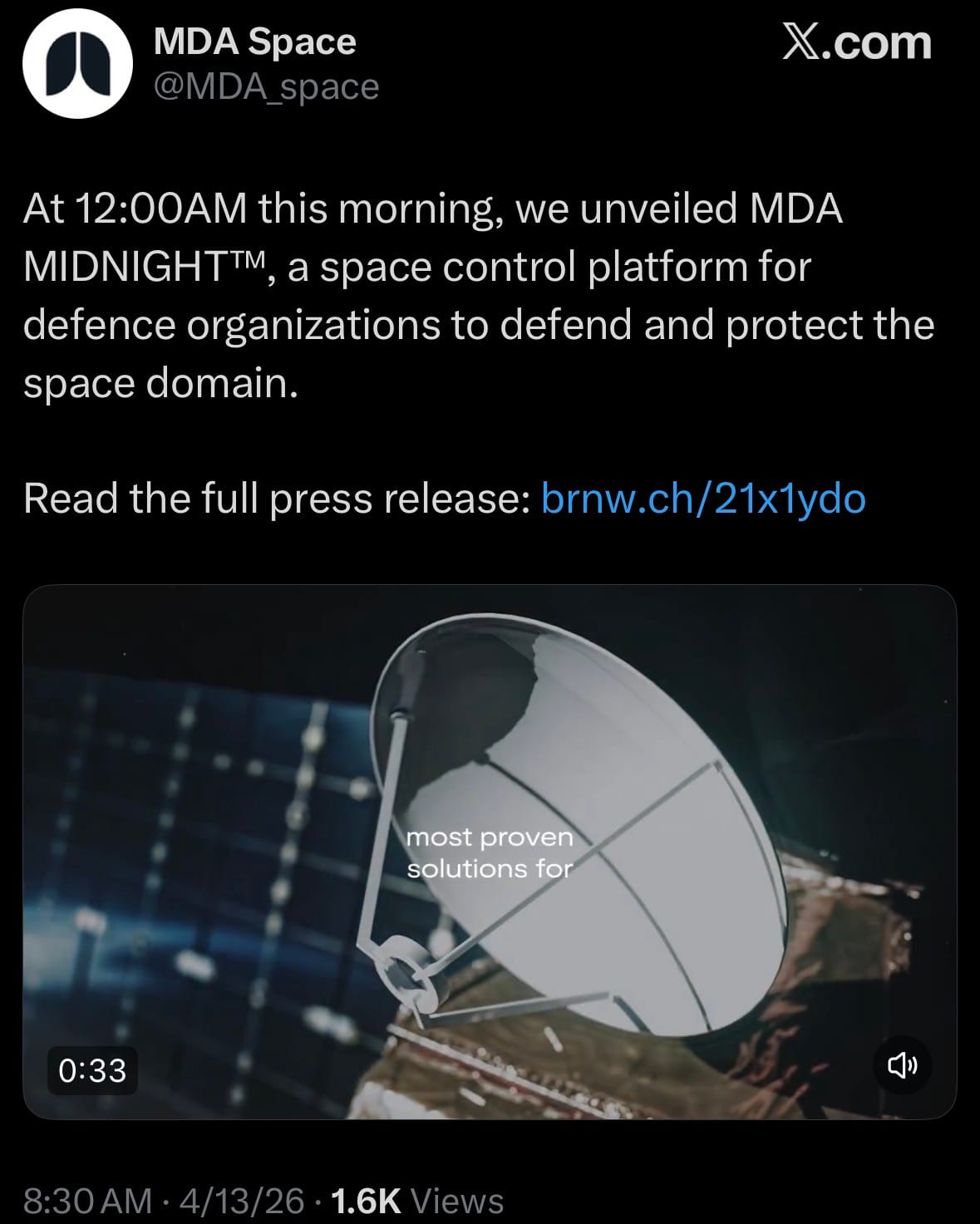 - On April 13, 2026, MDA Space unveiled MDA MIDNIGHT™, a highly maneuverable spacecraft platform designed for defense organizations to defend and protect the space domain using high-reliability rendezvous and proximity operations (RPO), advanced robotics, and space domain awareness capabilities.