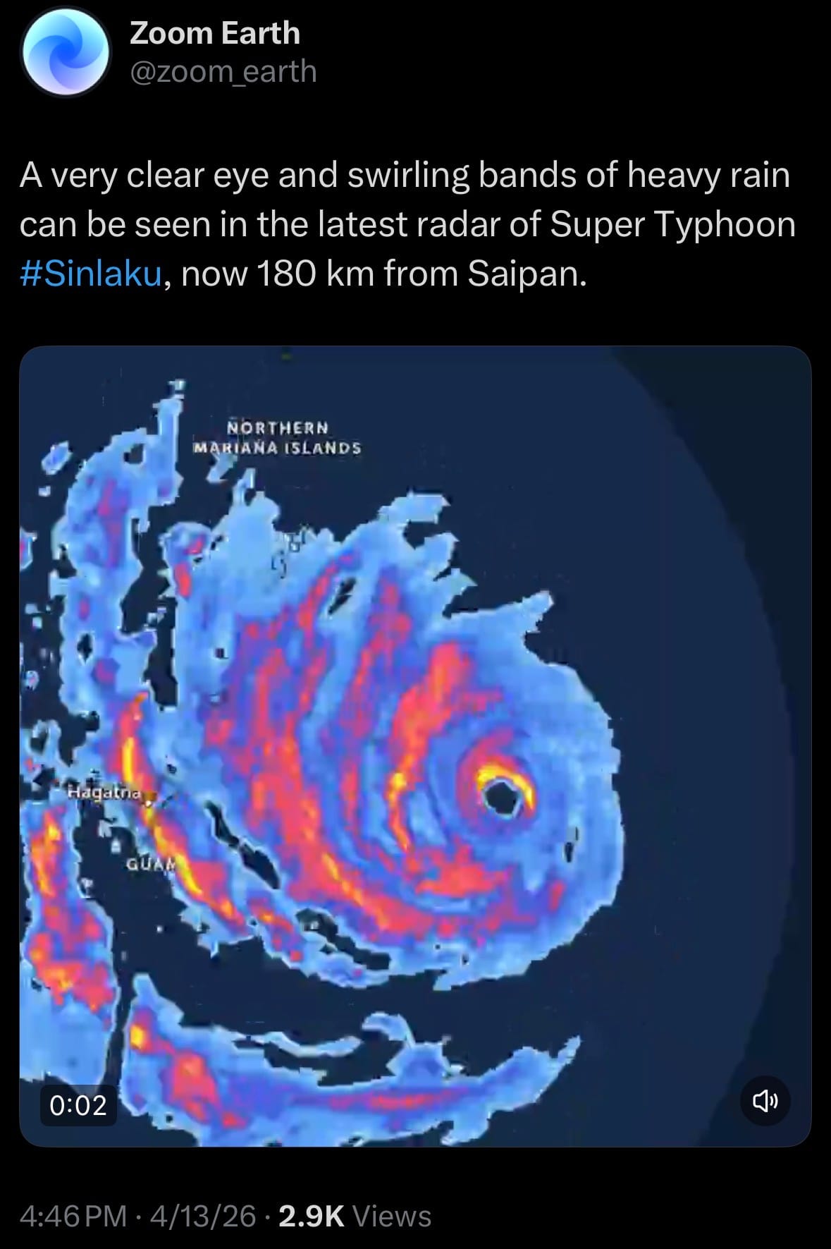 - As of Tuesday, April 14, 2026, at 7:58 AM ChST, Super Typhoon Sinlaku (04W) is a powerful Category 5 storm with maximum sustained winds near 180 mph, tracking northwest toward the Northern Mariana Islands.