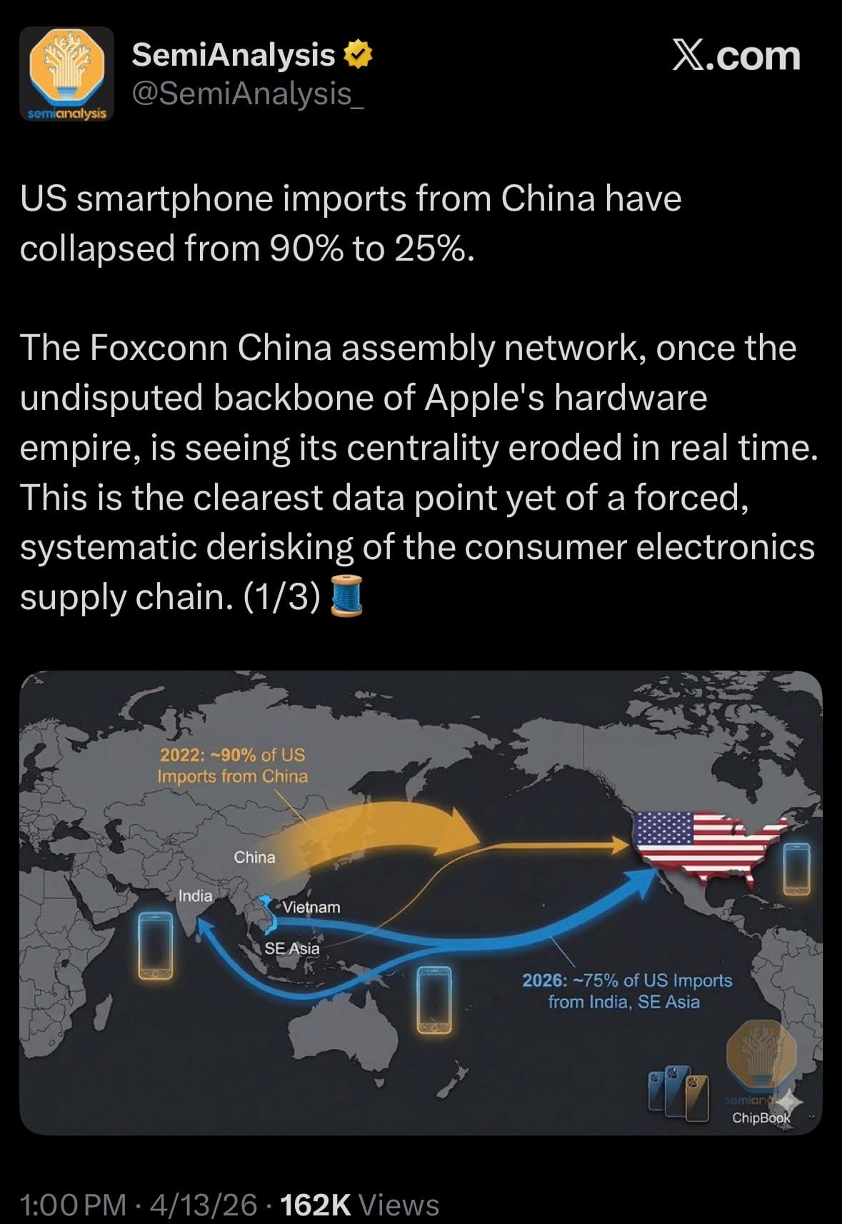 - US smartphone imports from China have collapsed from around 90% dominance in recent years to just 25% in Q2 2025, with India surging to 44% and Vietnam at 30% as Apple and other manufacturers accelerate final assembly shifts to avoid tariffs and geopolitical risks.