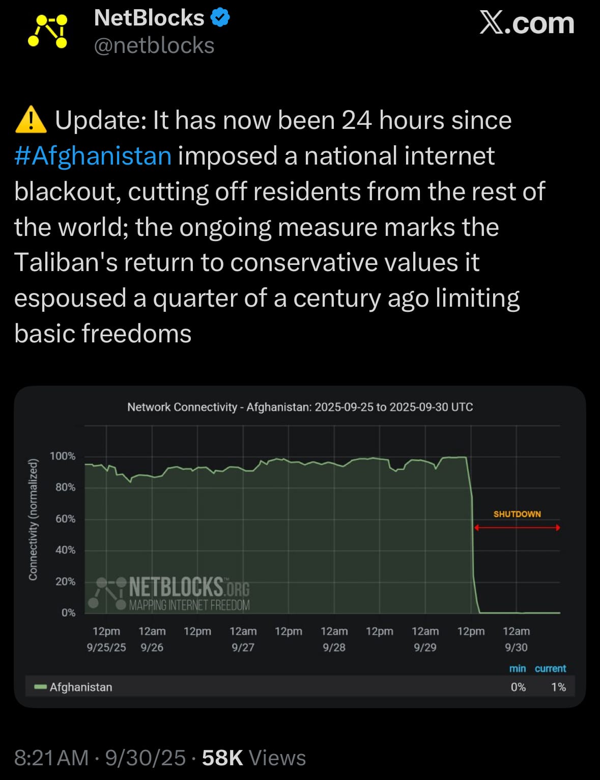 - On September 29, 2025, Afghanistan entered a complete nationwide internet blackout as Taliban authorities systematically disconnected multiple networks starting in the morning, expanding from initial restrictions in northern provinces on September 17 aimed at preventing "immoral activities." Connectivity levels fell to nearly zero, with telephone services also affected, impacting around 40 million people by restricting access to online information, financial services, education, and connections with relatives abroad. Organizations like NetBlocks confirmed the shutdown, while Taliban representatives framed it as part of morality enforcement, potentially with allowances for critical needs, though no end date was specified. This followed earlier disruptions in regions like Balkh, where fiber-optic services were cut, forcing reliance on expensive mobile data and affecting businesses, schools, and particularly women's online participation. As of September 30, 2025, at 9:25 PM Eastern Time, the blackout remains in effect, with no reports of restoration and continued disruptions to mobile and internet services across the country.