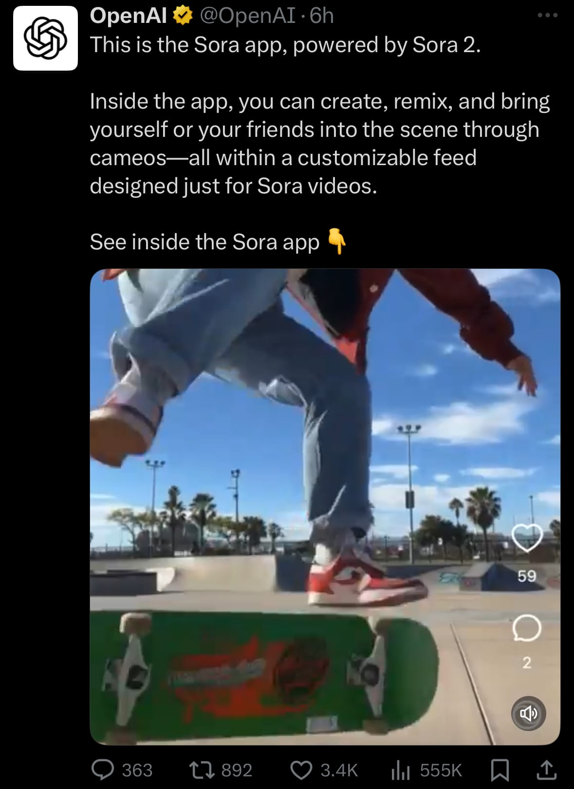 - On September 30, 2025, OpenAI released Sora 2, an updated AI model for video generation based on the original Sora introduced in February 2024, along with a new standalone iOS app that allows users to create, share, and view AI-generated videos. Key additions include audio support for sound effects and music, consistent character rendering for lifelike appearances (including options for user likenesses), enhanced simulation of physics and movement, and outputs at resolutions up to 1080p at 60 frames per second for videos lasting up to 20 seconds. Initial access is limited to an invite-only rollout for iOS users, with plans for wider availability later, including a web interface at sora.com, integration with ChatGPT for Pro subscribers, and an upcoming API for developers.