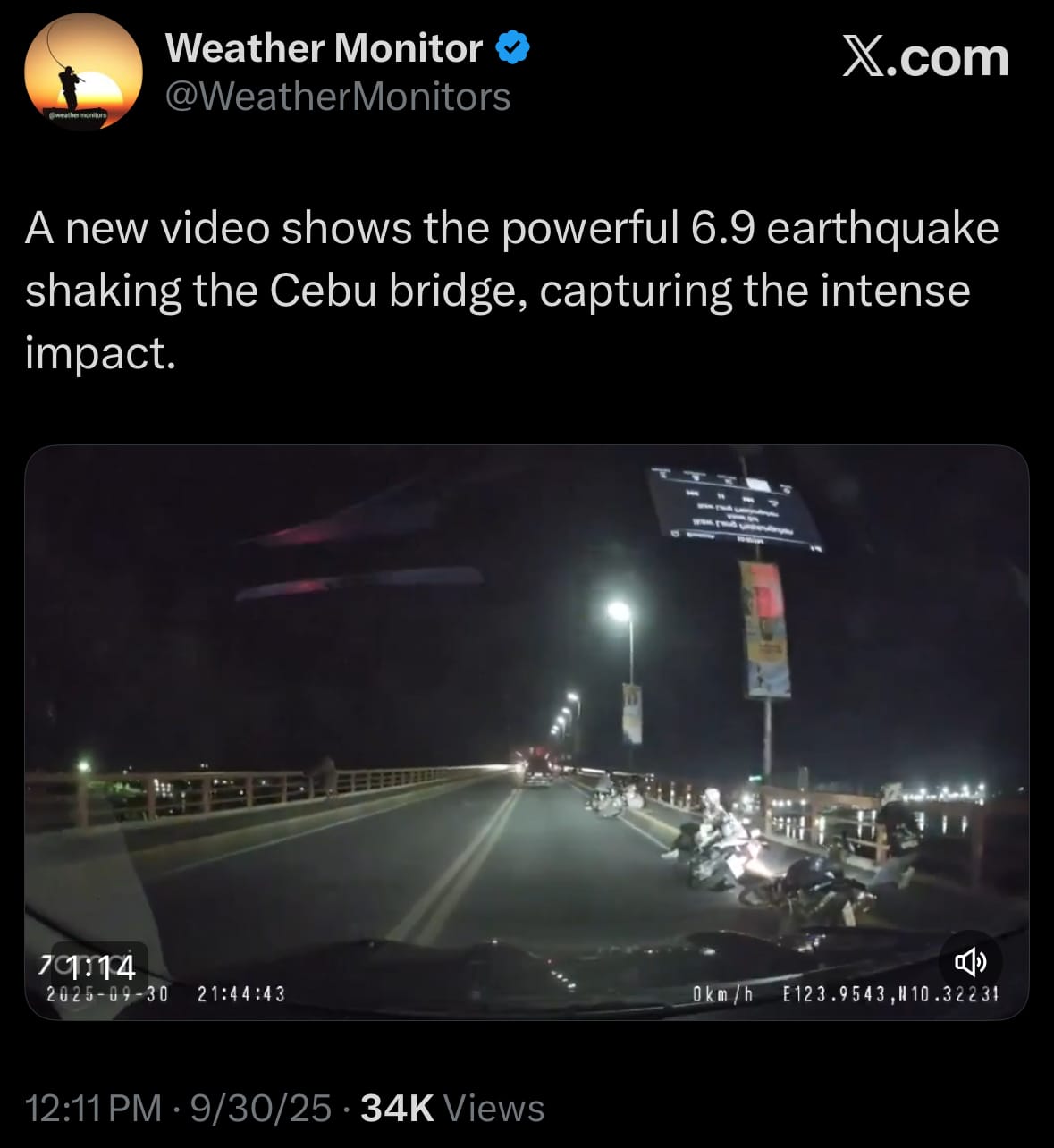 - On September 30, 2025, a 6.9-magnitude earthquake occurred in the Visayan Sea in the central Philippines at about 9:59 p.m. local time (13:59 UTC), located roughly 54 km west of Ormoc City in Leyte province, as reported by the United States Geological Survey and the Philippine Institute of Volcanology and Seismology. The event happened at a depth of 10 km, causing intense shaking in the Visayas region, including Cebu, Bohol, and Negros islands, though no tsunami alert was triggered since the offshore epicenter was not anticipated to produce major waves. It ranks among the most powerful earthquakes in the Philippines this year, occurring in a seismically active zone near the Philippine Trench.