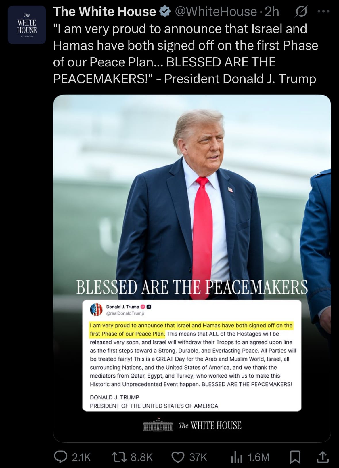 - On October 8, 2025, Israel and Hamas reached an agreement on the first phase of a Gaza ceasefire deal, as announced by U.S. President Donald Trump. The deal involves Hamas releasing approximately 20 to 50 hostages, including both living individuals and remains, in exchange for Israel freeing nearly 2,000 Palestinian prisoners. This breakthrough follows months of stalled negotiations and aims to initiate a broader peace framework to end the two-year conflict in Gaza. Officials from both sides confirmed their commitment to the terms, with mediation efforts led by the United States playing a key role in facilitating the talks.