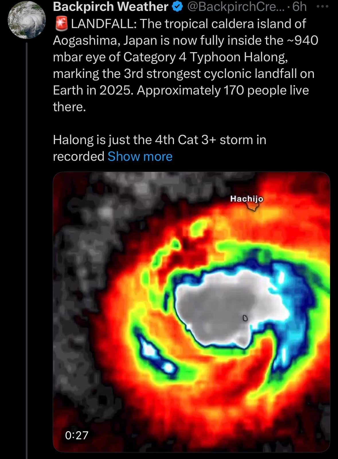 - On October 8, 2025, Typhoon Halong, a Category 4 storm with a central pressure around 940 millibars, made landfall on Aogashima, a remote volcanic caldera island in Japan's Izu chain, placing the entire island within its eye. Home to approximately 170 residents, Aogashima experienced extreme conditions as the typhoon brought violent winds, heavy rain, and high waves to the region. The Japan Meteorological Agency issued emergency warnings for the Izu Islands, including Hachijojima and Aogashima, urging precautions against what officials described as potentially once-in-decades storm impacts. The typhoon, moving northeast at about 25 kilometers per hour, prompted evacuations and safety measures, though no immediate reports of casualties or major damage emerged from the isolated location.