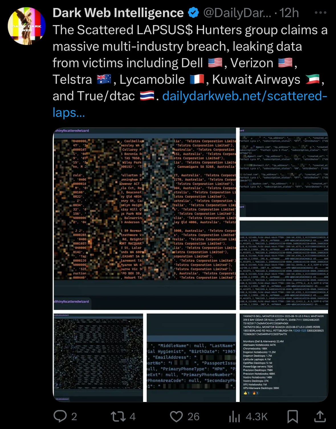 - As of October 8, 2025, a hacking group called Scattered LAPSUS$ Hunters claimed to have stolen data from companies in tech, telecom, and aviation. They posted sample data on their Telegram channel to prove it. The companies mentioned include Dell and Verizon in the US, Telstra in Australia, Lycamobile (with data tied to France), Kuwait Airways in Kuwait, and True Corporation plus dtac in Thailand. The stolen information differs by company but includes names, addresses, phone numbers, emails, birth dates, job titles, passports, national IDs, IP addresses, order histories, product serial numbers, mobile plans, and call logs.