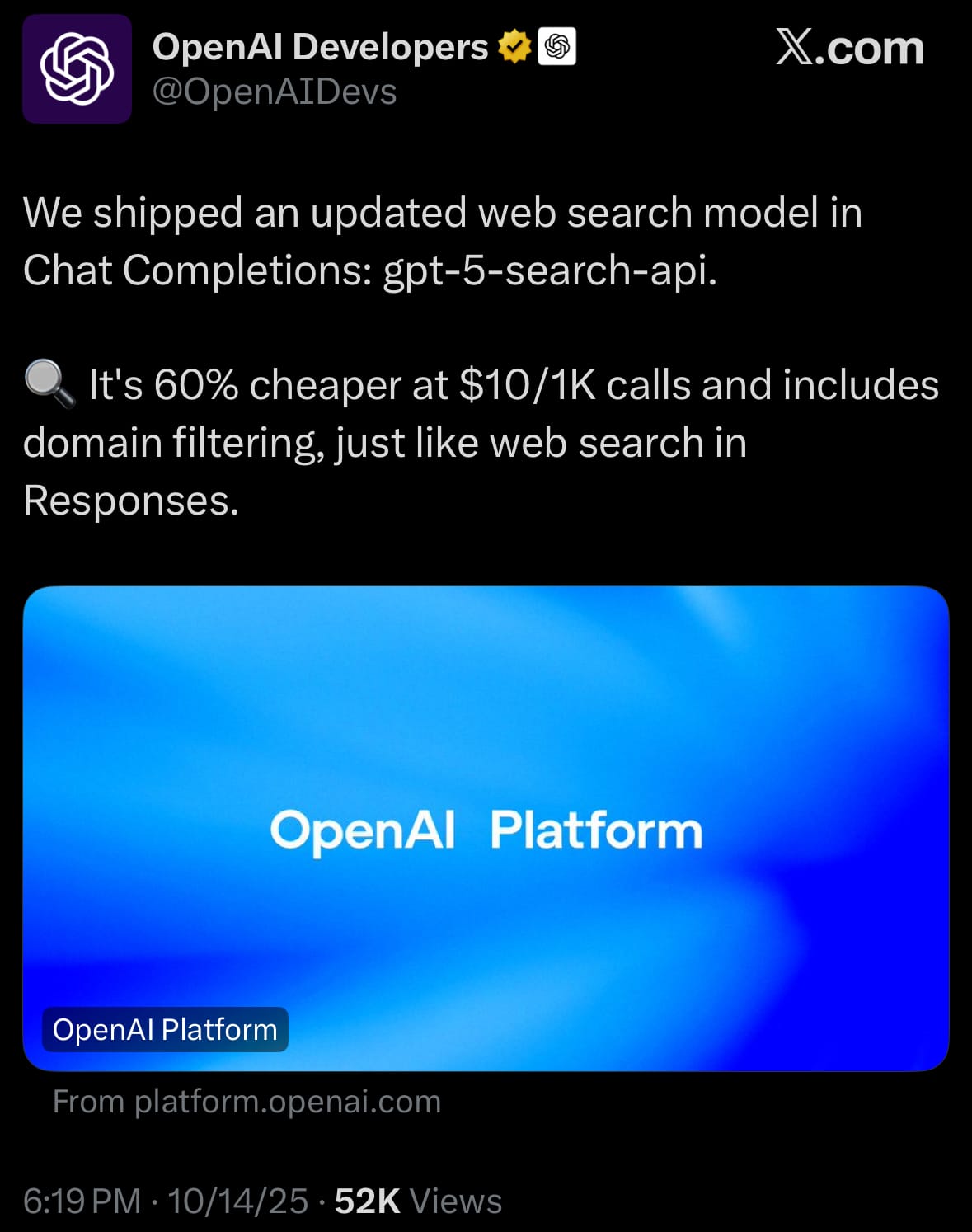 - On October 14, 2025, OpenAI released a new web search model named gpt-5-search-api, available for use in its Chat Completions API. This model is based on the GPT-5 architecture, which was first introduced in August 2025 as a major upgrade for tasks like coding, reasoning, and general intelligence. The gpt-5-search-api is designed to handle web searches more efficiently, offering a 60% cost reduction compared to previous versions, priced at $10 per 1,000 calls. It also includes domain filtering, allowing users to restrict searches to specific websites, much like the web search feature in OpenAI's Responses tool. Developers can access it immediately on the OpenAI platform for integrating search capabilities into applications.