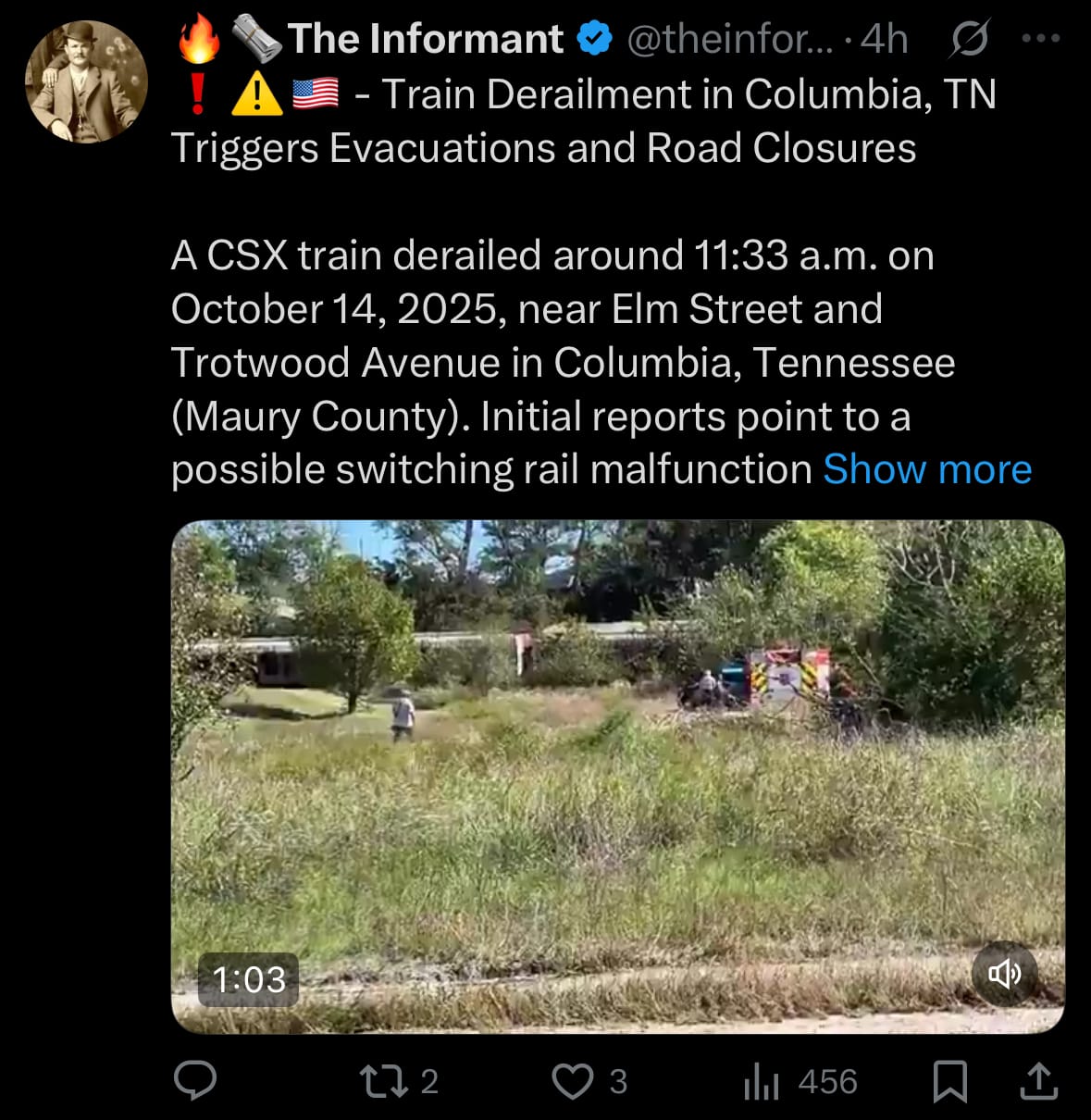 - On October 14, 2025, a CSX freight train derailed at about 11:33 a.m. near Elm Street and Trotwood Avenue in Columbia, Tennessee, in Maury County, possibly caused by a problem with the rail switching system. The derailment affected multiple rail cars, which included empty cars for automobiles and one propane tanker with no detected leaks. No one was hurt, and all train crew were safe, but officials ordered evacuations as a safety measure for nearby homes, Columbia Academy's Columbia campus, and local businesses. School buses left at 1:00 p.m., after-school programs were canceled, and the Spring Hill campus stayed normal.
