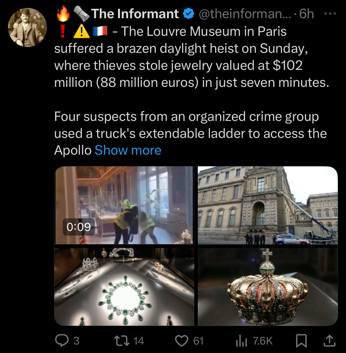 - As of October 22, 2025, the Louvre Museum in Paris remains closed following a major jewelry heist on October 19, where thieves disguised as construction workers stole eight pieces from the French Crown Jewels collection in the Galerie d'Apollon. The raid, which lasted just seven minutes, involved the perpetrators using an angle grinder to break into display cases and escape with items valued at $102 million, including a crown worn by Empress Eugenie that was dropped during the getaway. No casualties were reported, and the thieves left behind tools at the scene, prompting an immediate lockdown of the museum and a police investigation.